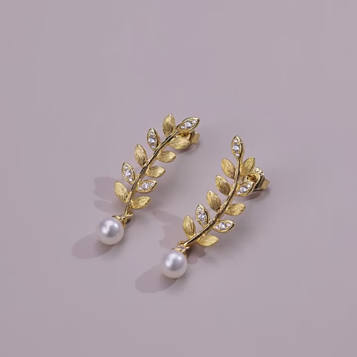 These charming earrings feature a delicate leaf design, embellished with sparkling white zircons. Each earring is finished with a lustrous pearl drop, adding a touch of elegance.