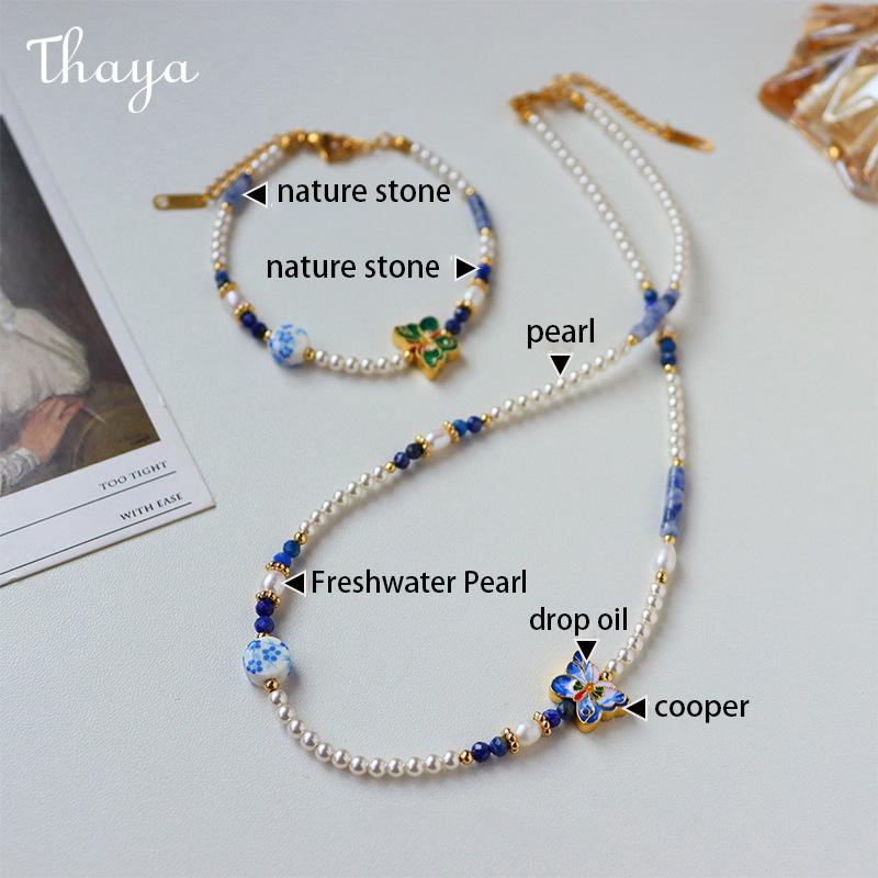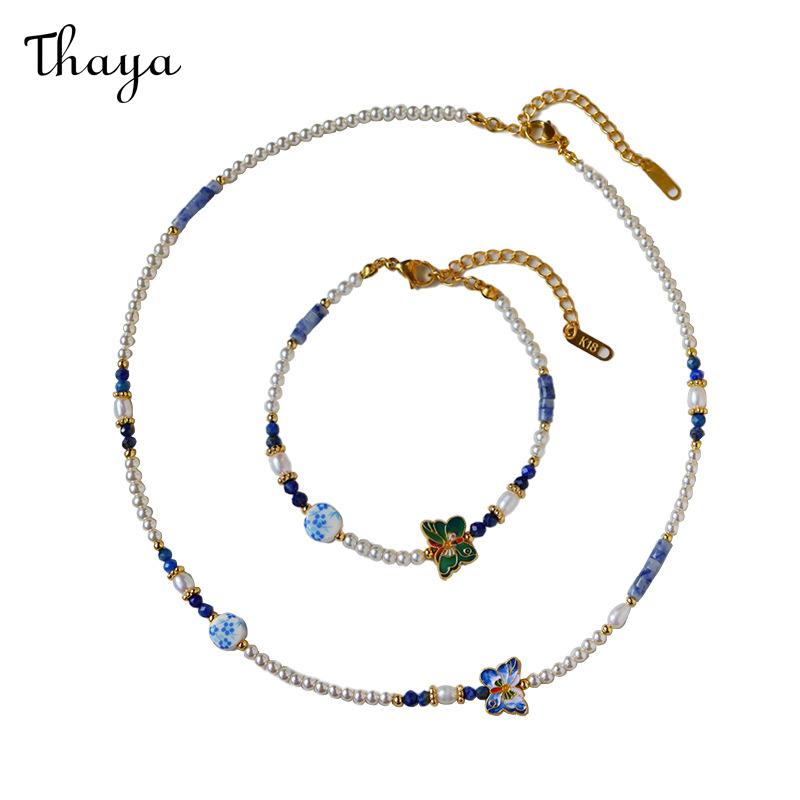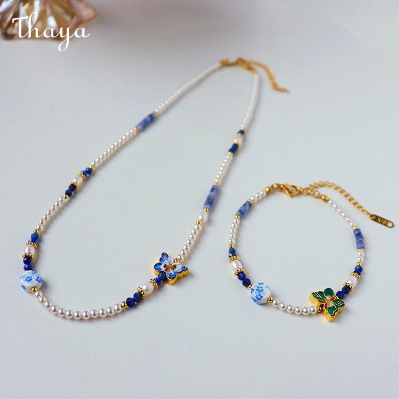This charming jewelry set includes a matching necklace and bracelet, featuring delicate pearls and vibrant butterfly charms.