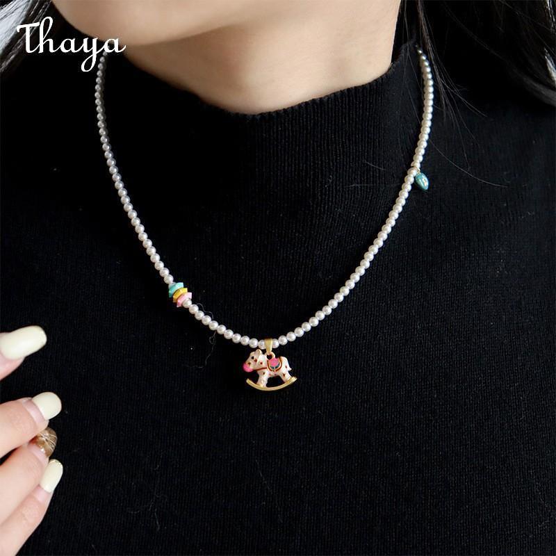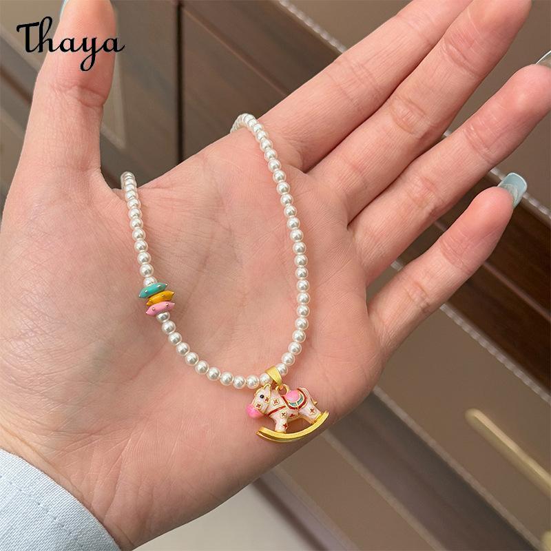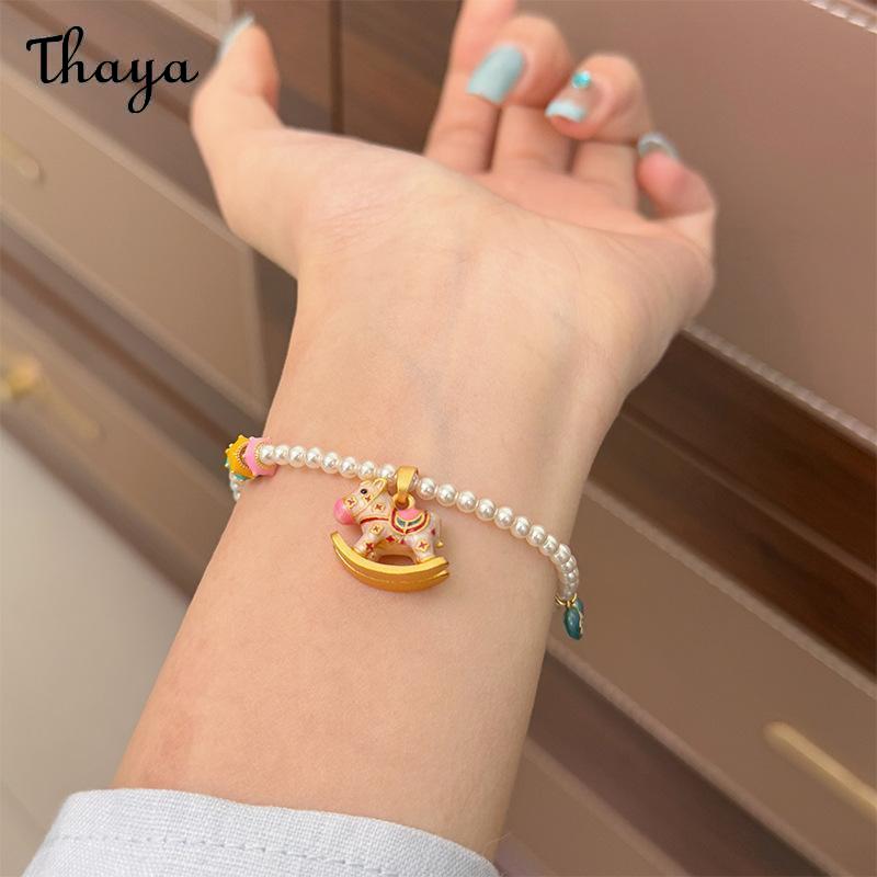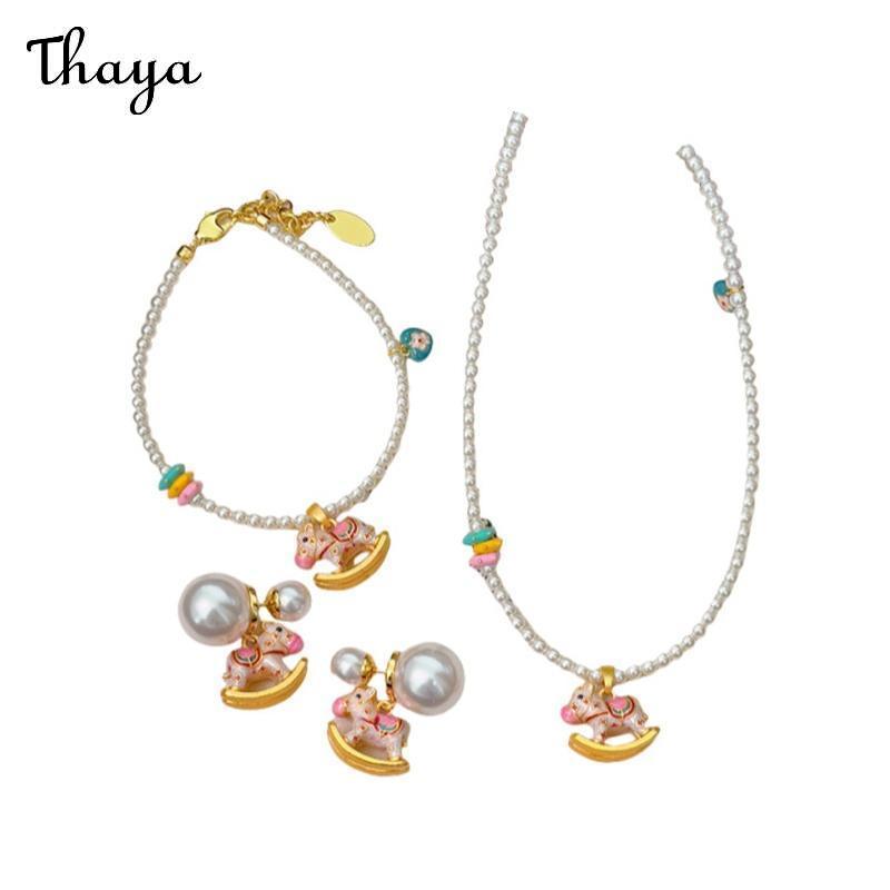 This adorable jewelry set features a playful rocking horse design. It includes a necklace, bracelet, and earrings, each adorned with lustrous pearls and a charming rocking horse pendant/charm.
