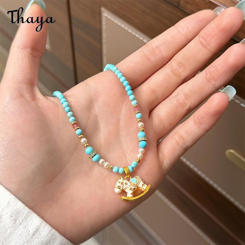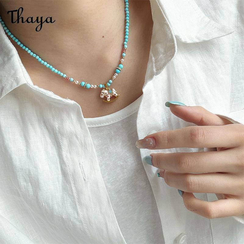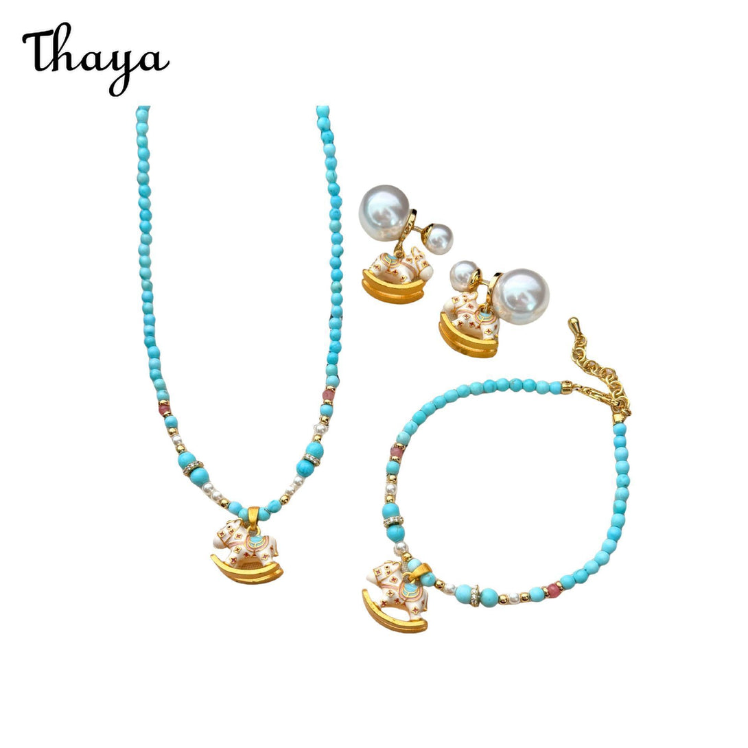 This charming jewelry set features a delightful rocking horse design. The set includes a necklace, bracelet, and a pair of earrings. Each piece is adorned with colorful beads and a rocking horse charm with a golden base.