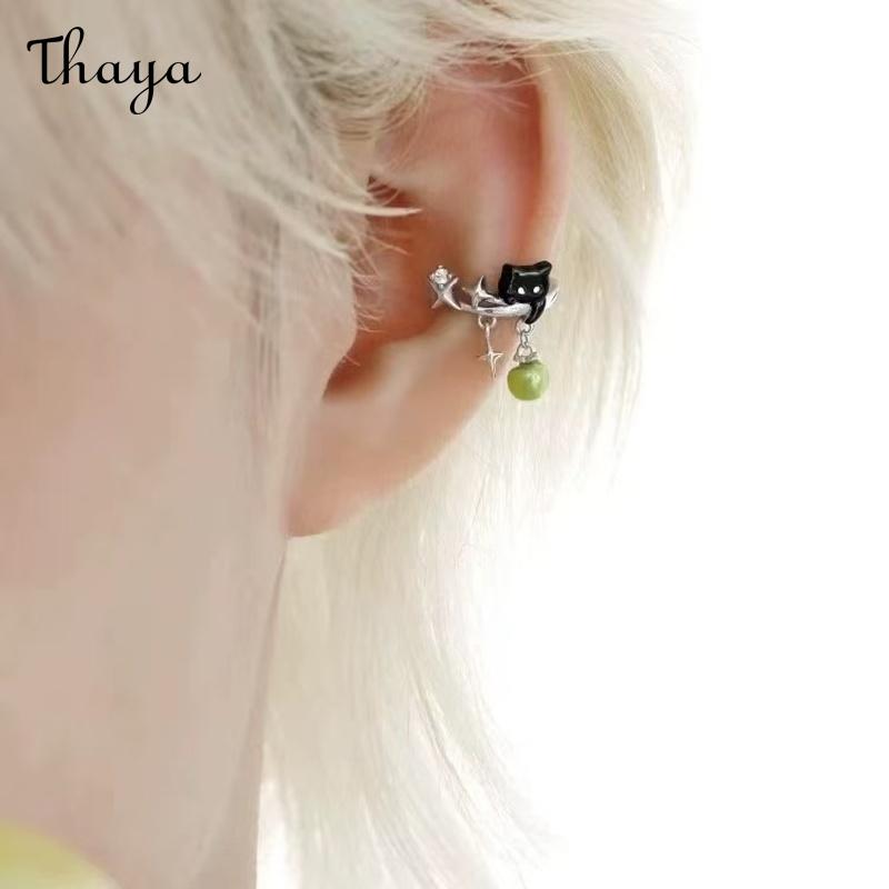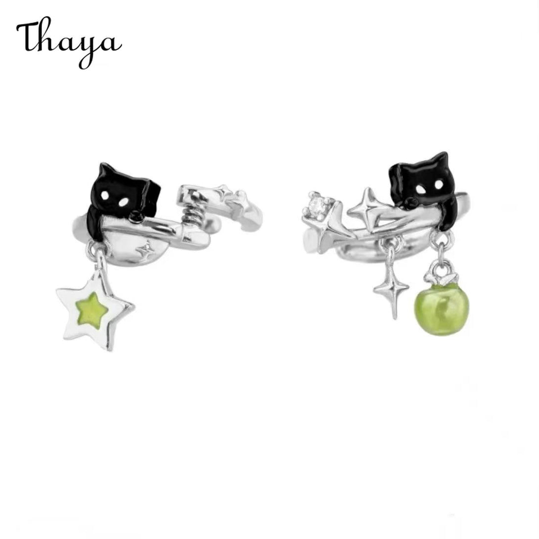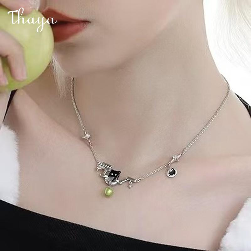 Thaya Cute Black Cat Green Apple Necklace & Ear Clips