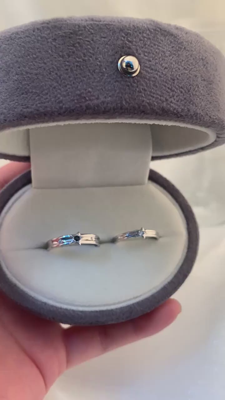 - Design: Matching rings with star-shaped accents, one with black zircon and one with white zircon.