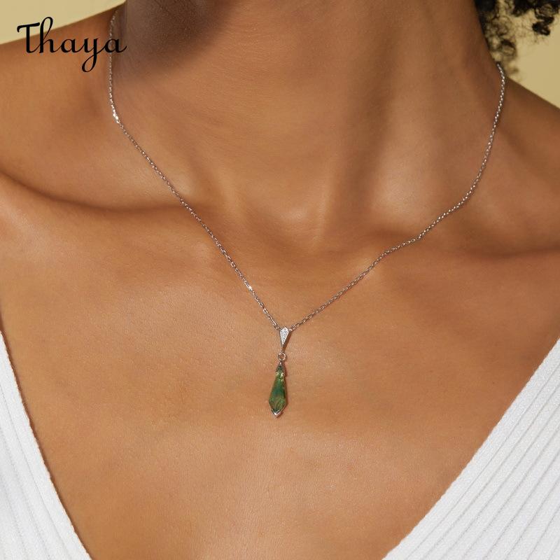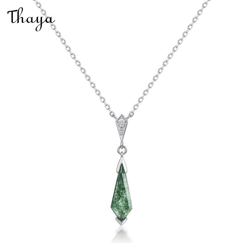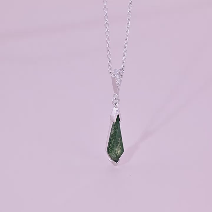 This elegant necklace features a unique teardrop design. The S925 silver plated chain supports a pendant with a shimmering green moss stone at the bottom, and a triangle decoration embedded with bright stones.
