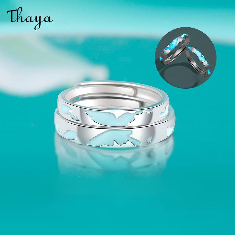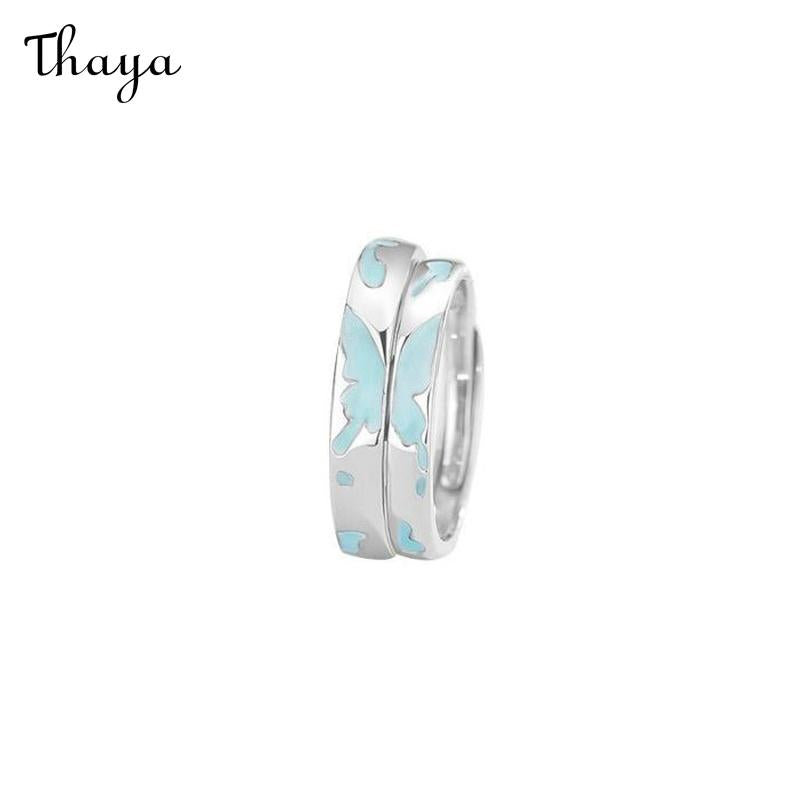 These rings feature a unique design where a butterfly is split between the two bands. When placed together, the bands complete the butterfly design. The luminous effect adds an enchanting glow.
