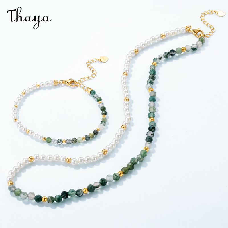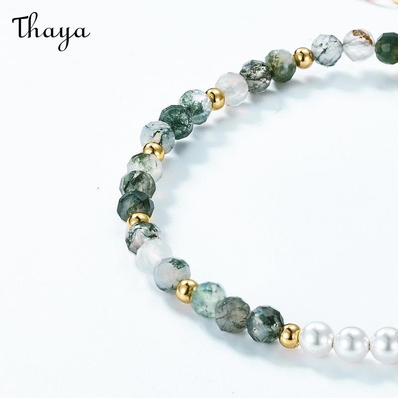 • Features a delicate arrangement of pearls and green moss stones, interspersed with small gold-colored beads.