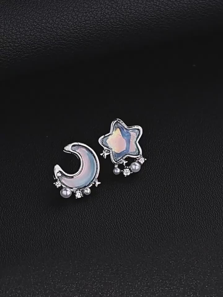 These charming earrings feature an asymmetrical design, with one earring shaped like a star and the other like a crescent moon. Each earring is adorned with iridescent resin that gives a pearlescent, dreamy effect.