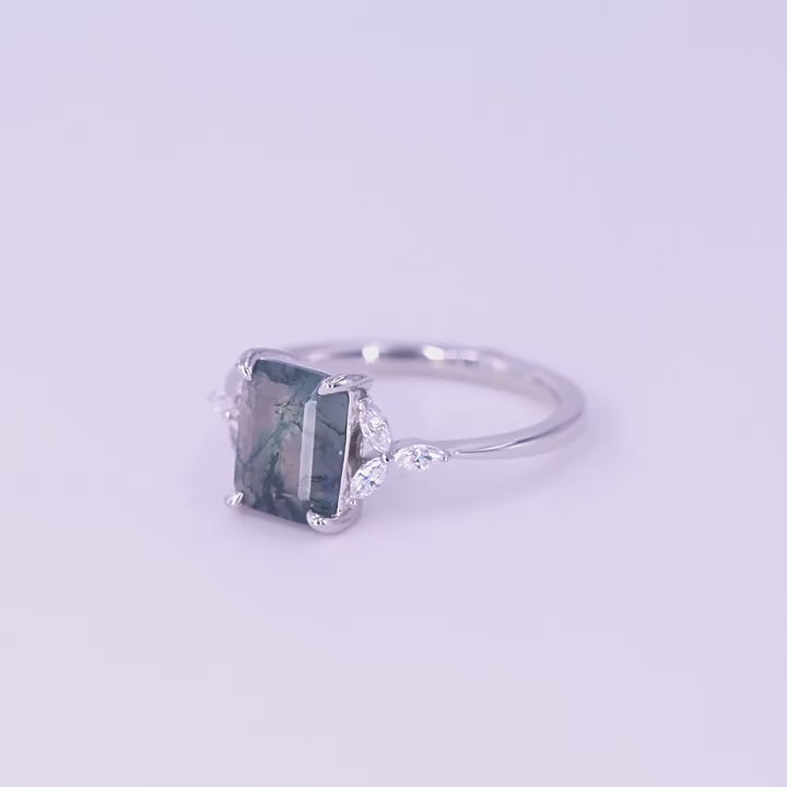 This exquisite ring features a captivating green moss stone. The central stone is a 7*9mm rectangular cut, set in a S925 silver-plated thick silver-white gold band and is adorned with several small stones.