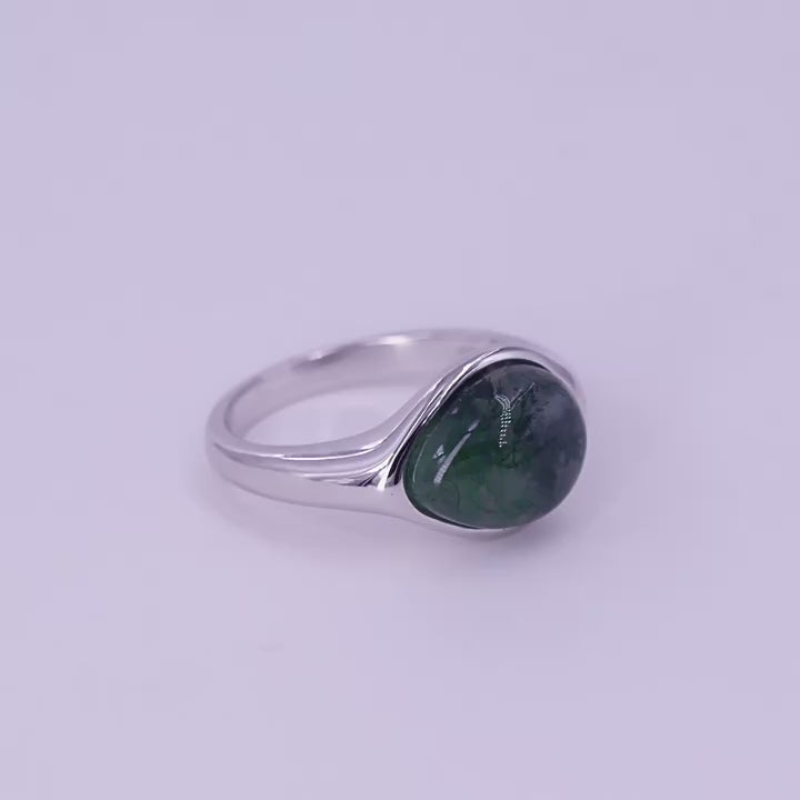 This classic ring features a unique green moss stone inlaid in a polished S925 silver setting. The stone's natural texture makes each piece one-of-a-kind, lending a gentle and refined touch.