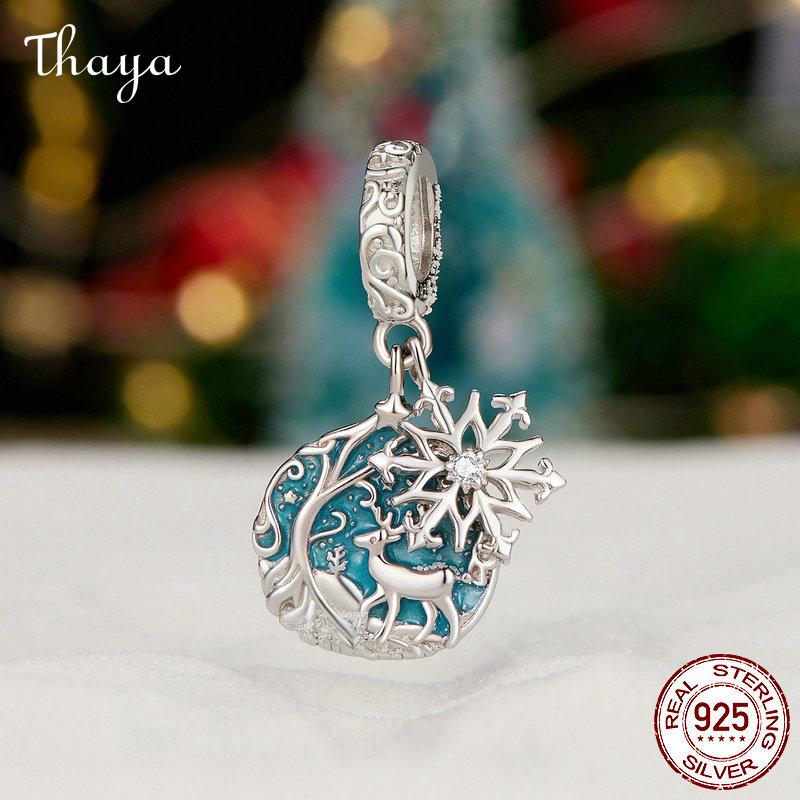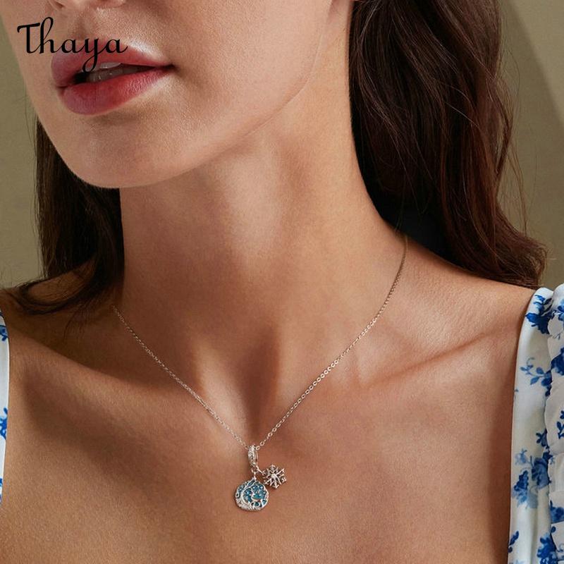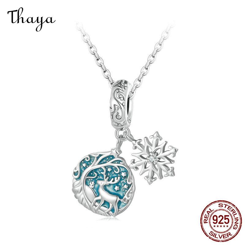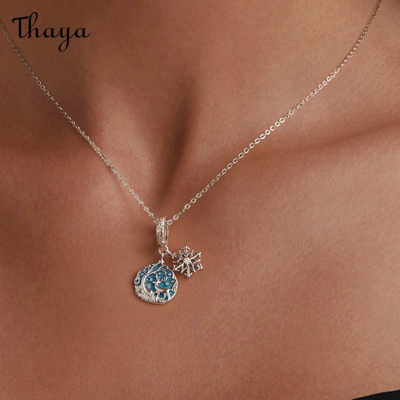 This charming necklace features a detailed design with a deer inside a circle and a delicate snowflake.The circle pendant is adorned with a glowing blue interior, depicting a serene forest scene with a deer silhouetted against a starlit sky. A sparkling snowflake charm adds a touch of winter magic. The pendant hangs gracefully from a classic silver chain.