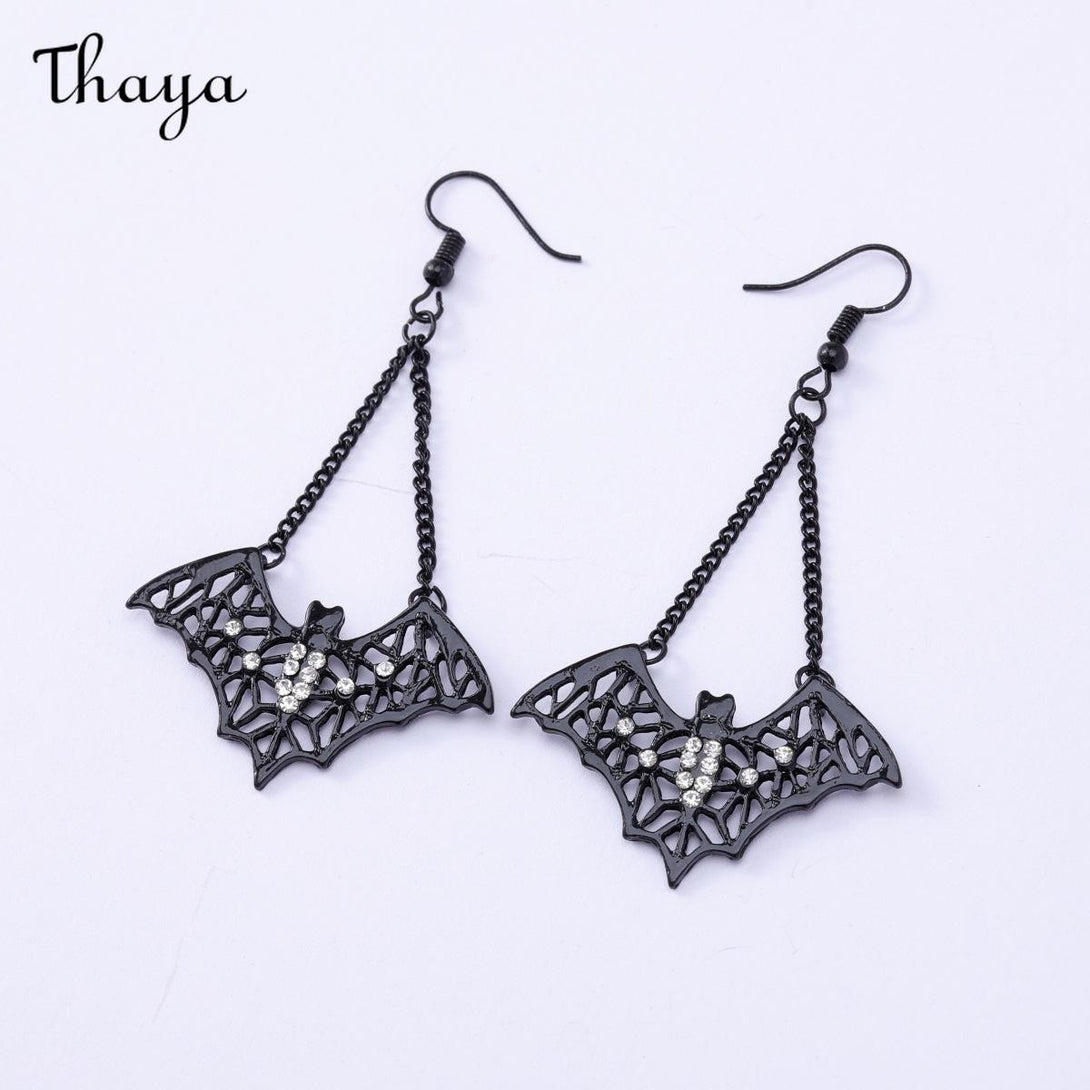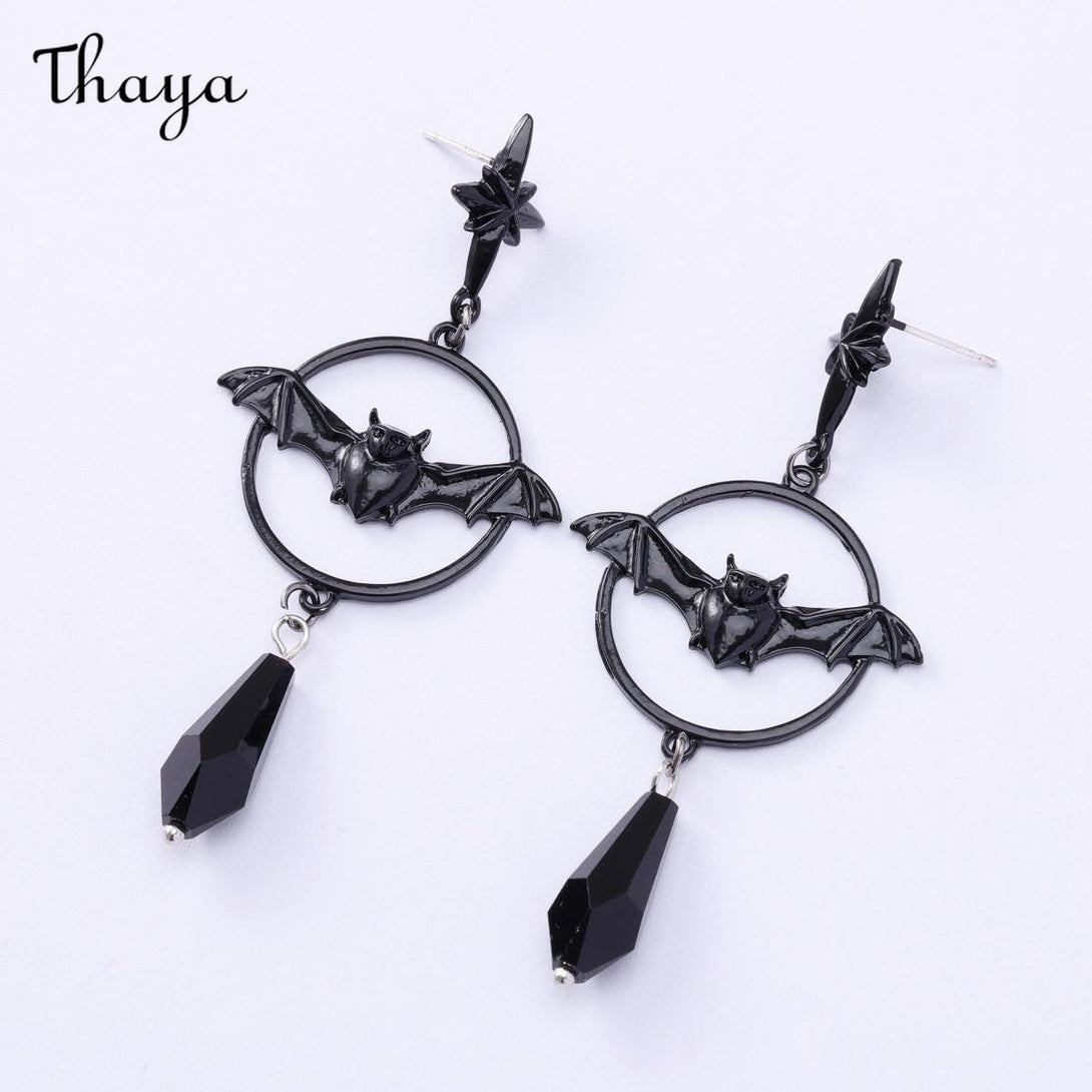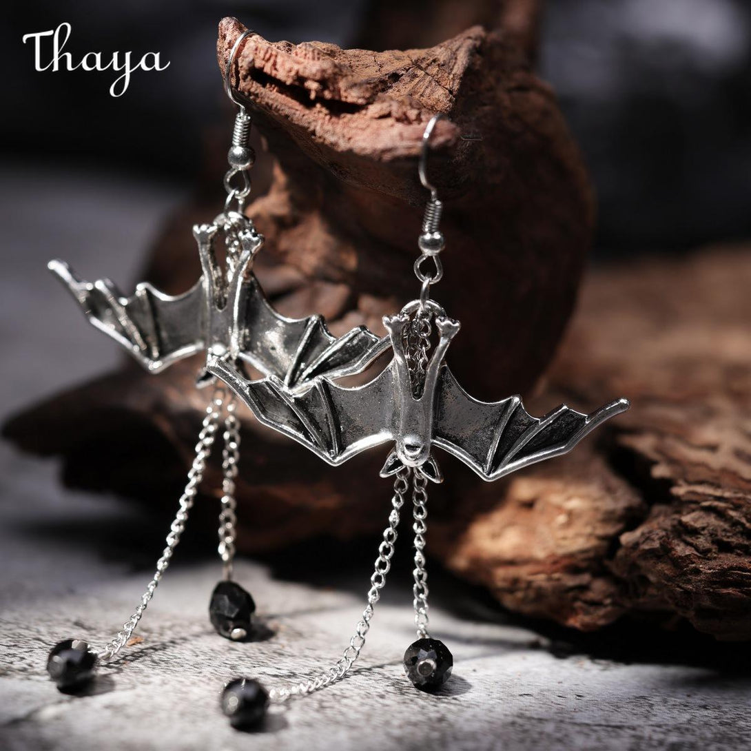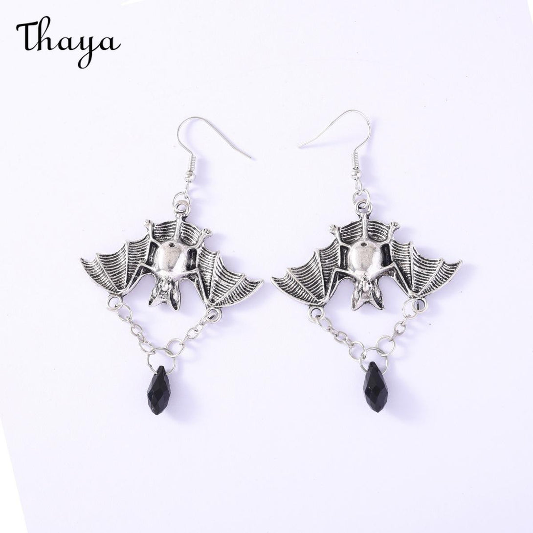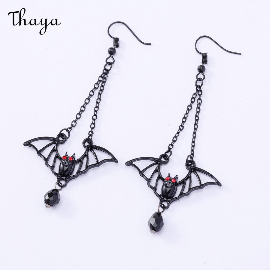 Embrace the night with these captivating bat earrings, featuring elegant red crystal drops.