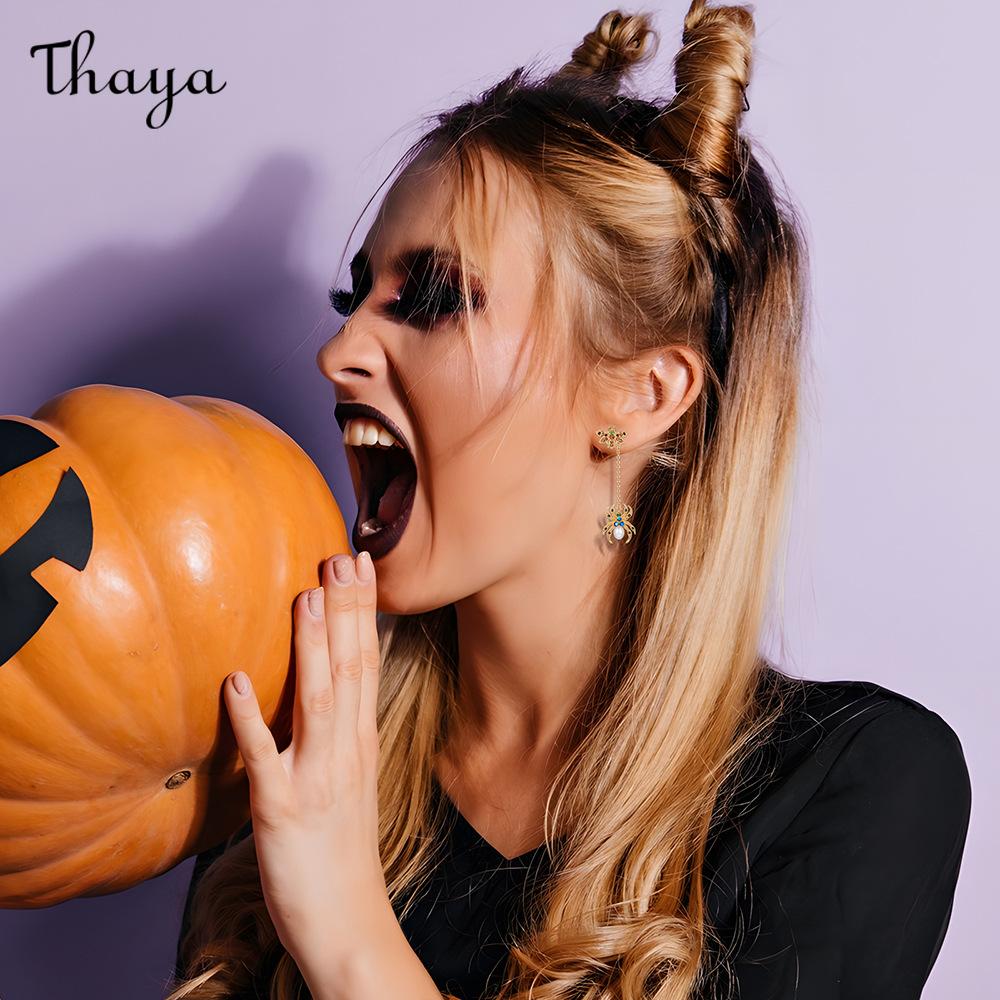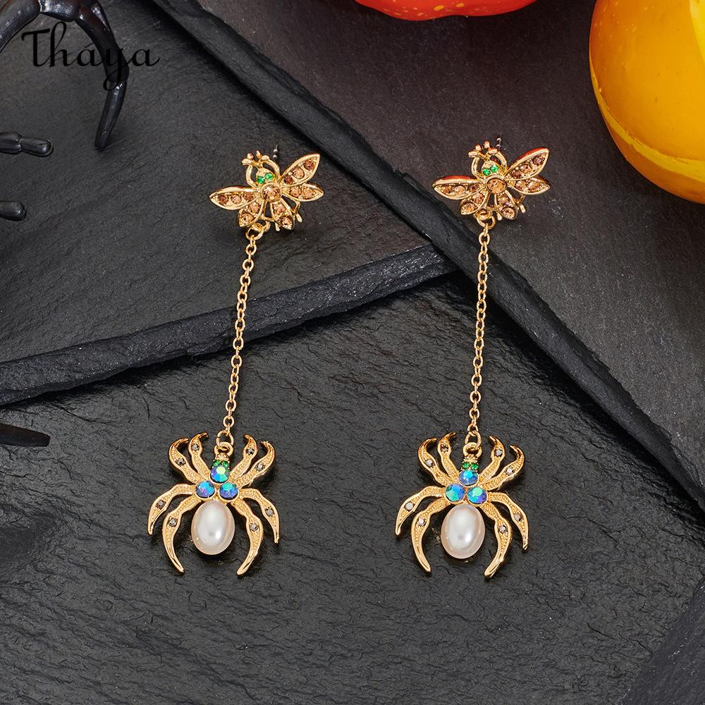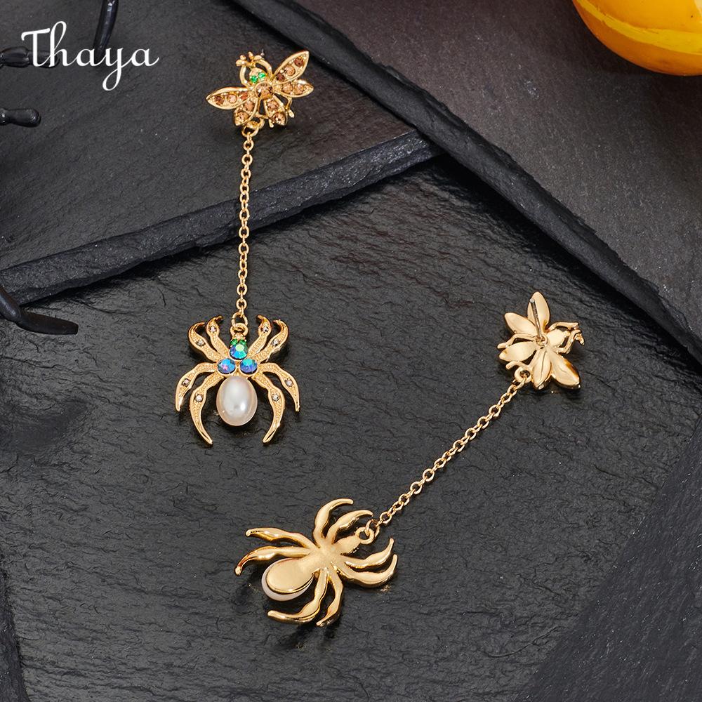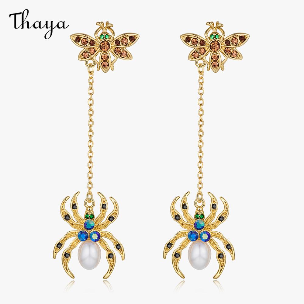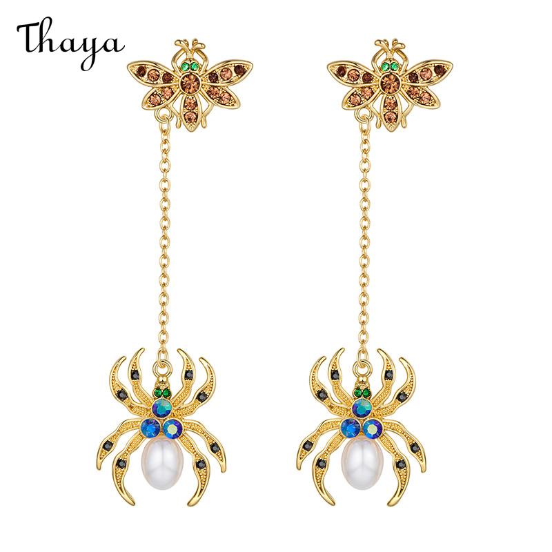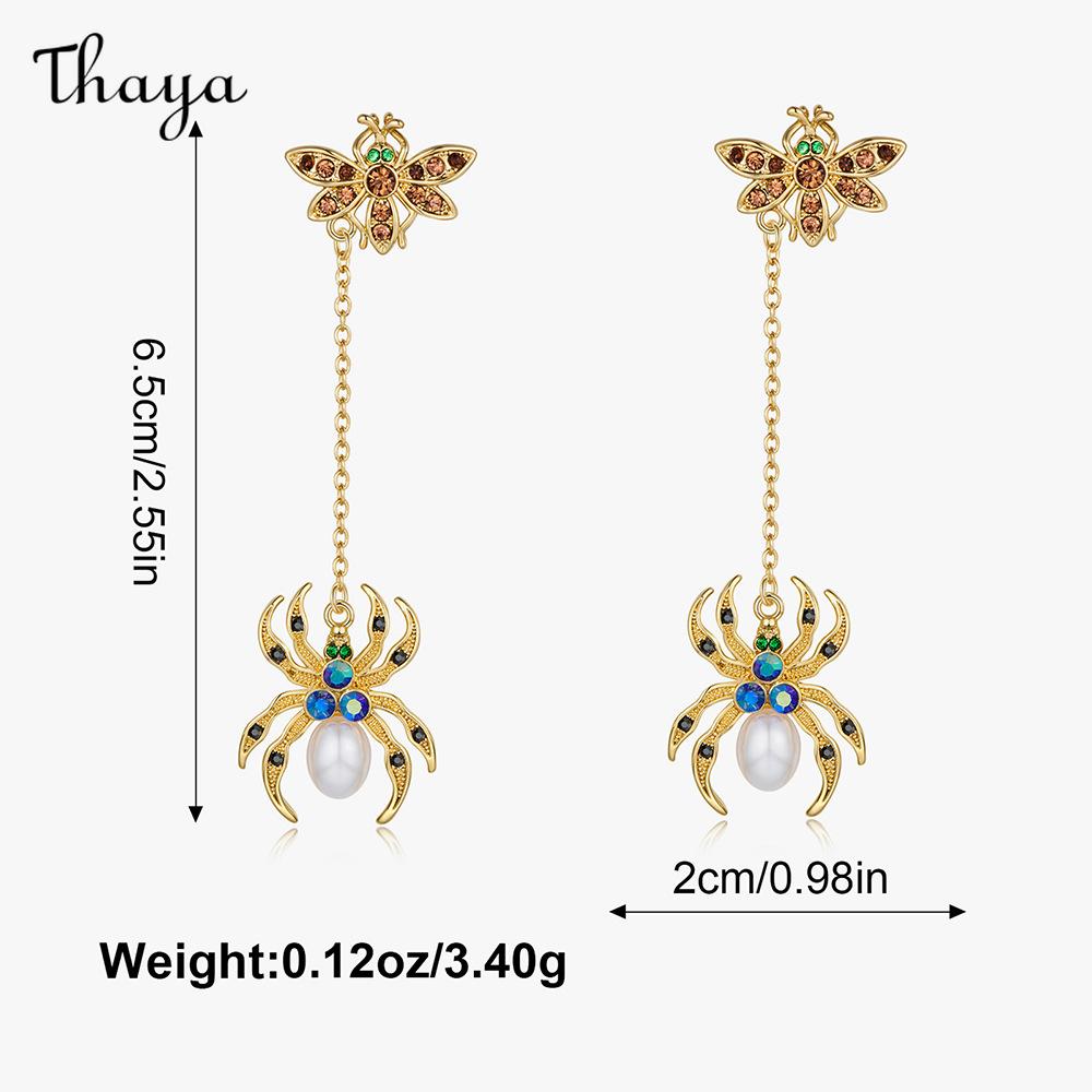 - Design: Unique dangle earrings featuring a butterfly on the top,connected by a delicate chain to a spider adorned with colorful gemstones and a central pearl.