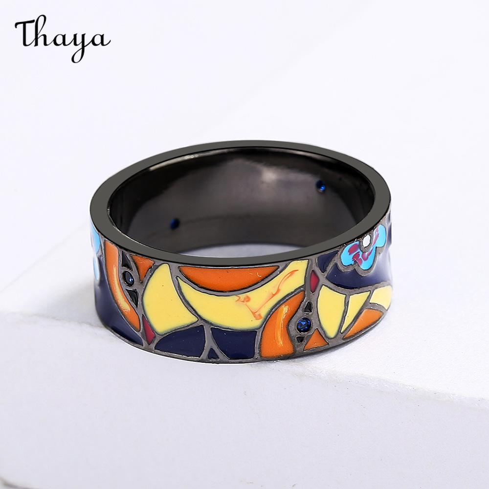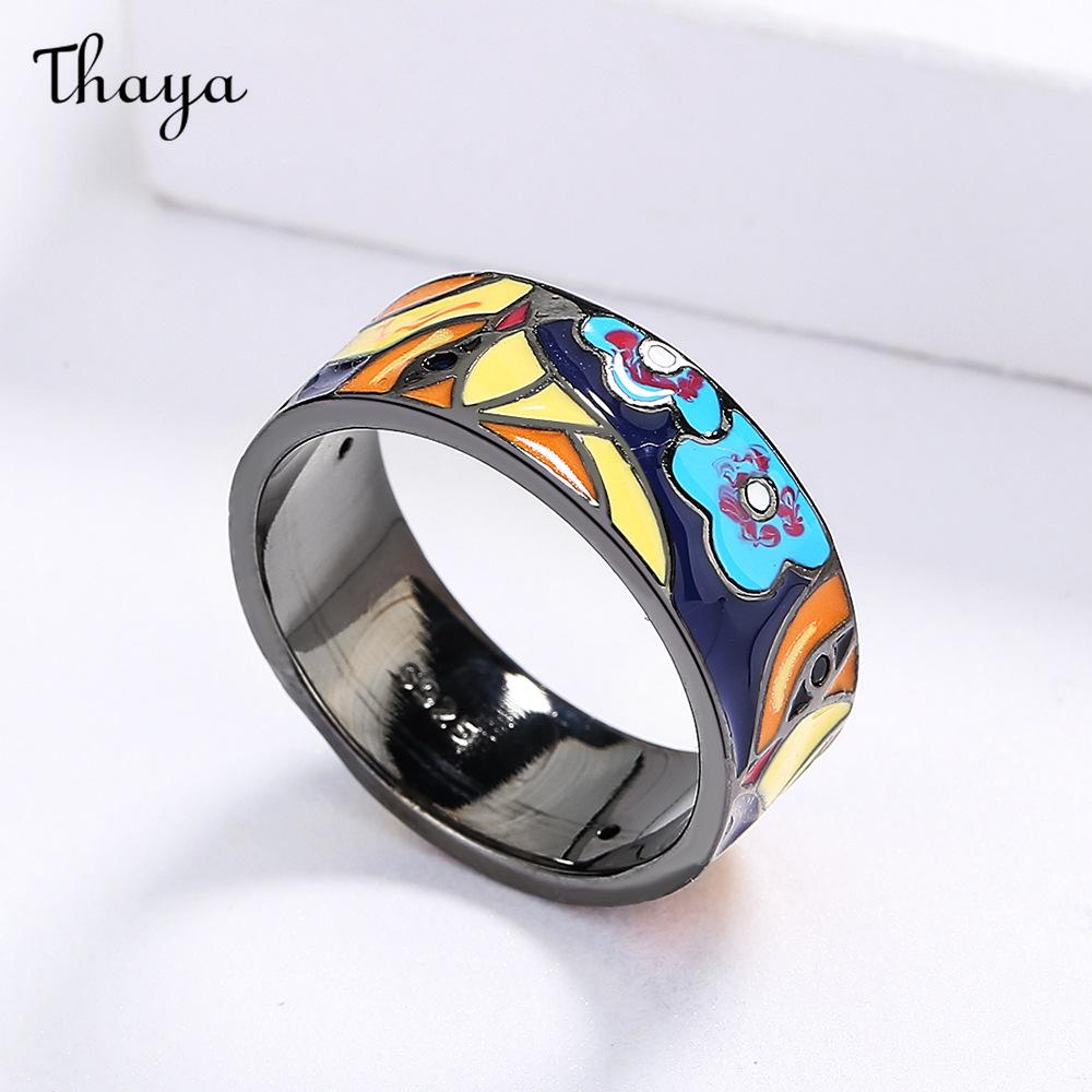 This striking ring showcases a vibrant enamel design. The band features a complex pattern of colorful floral and geometric shapes.