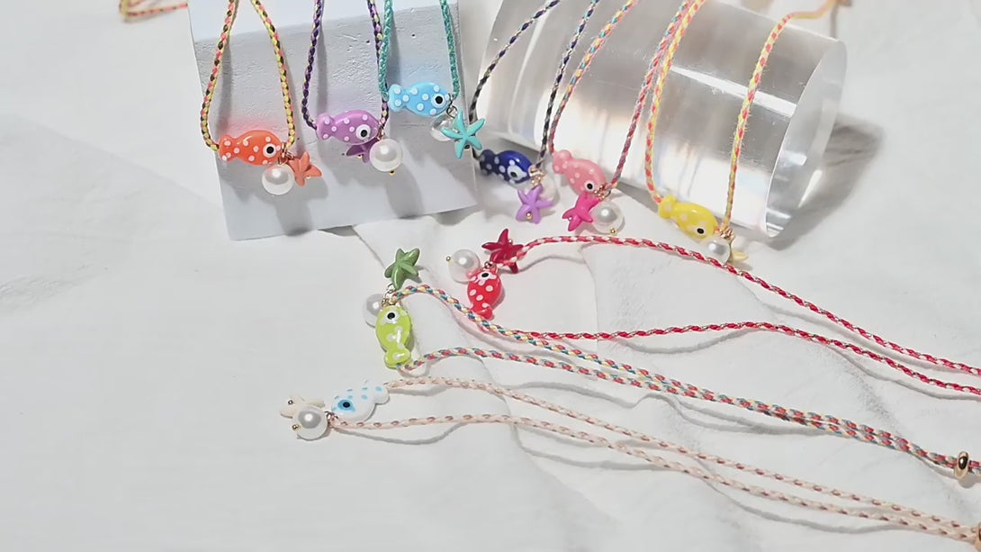 This whimsical necklace features adorable sea-themed charms. A pink ceramic fish is paired with a bright pink starfish and a lustrous pearl, all dangling from a colorful braided cord.