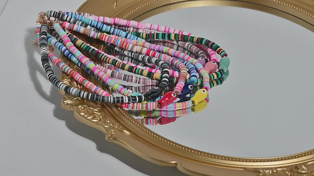 This trendy necklace set offers a stylish layered look with a playful touch. It features multiple strands with varying bead styles and a charming sea-themed pendant.