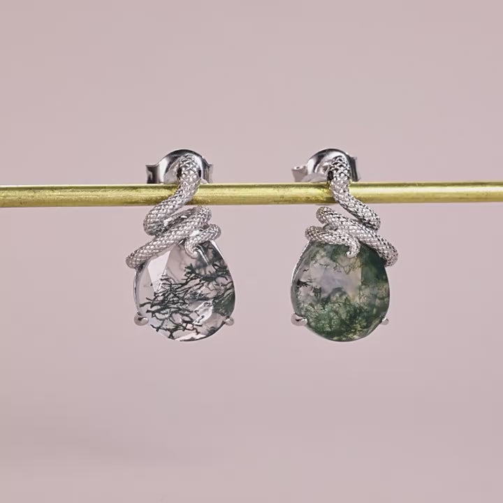 These striking earrings feature a unique snake design elegantly coiled around a teardrop-shaped moss agate stone.