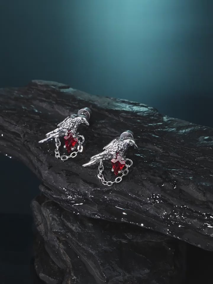 These unique earrings feature a detailed bird design, each clutching a vibrant red gemstone. A delicate chain elegantly connects the bird to the base, adding movement and flair.