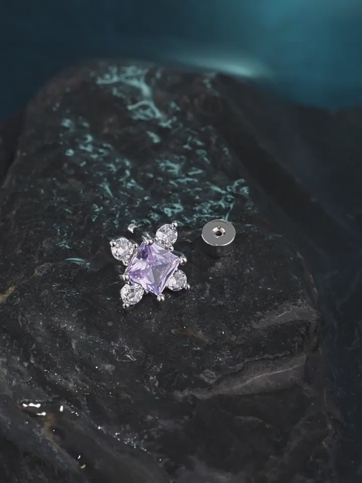 These stylish earrings feature a square-shaped design. At the center, there is a large square gemstone in a delicate purple color. Surrounding the central stone are smaller, round gems, adding to the overall sparkle and elegance.