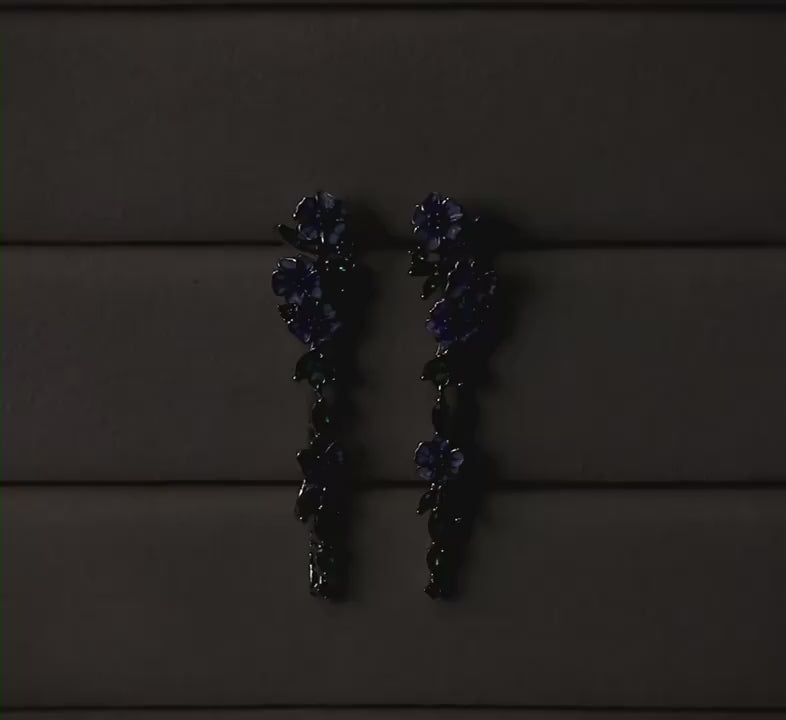 These elegant earrings feature a floral design with blue and white enameled flowers, complemented by sparkling green leaves. They hang gracefully, adding a touch of nature-inspired beauty to any look.