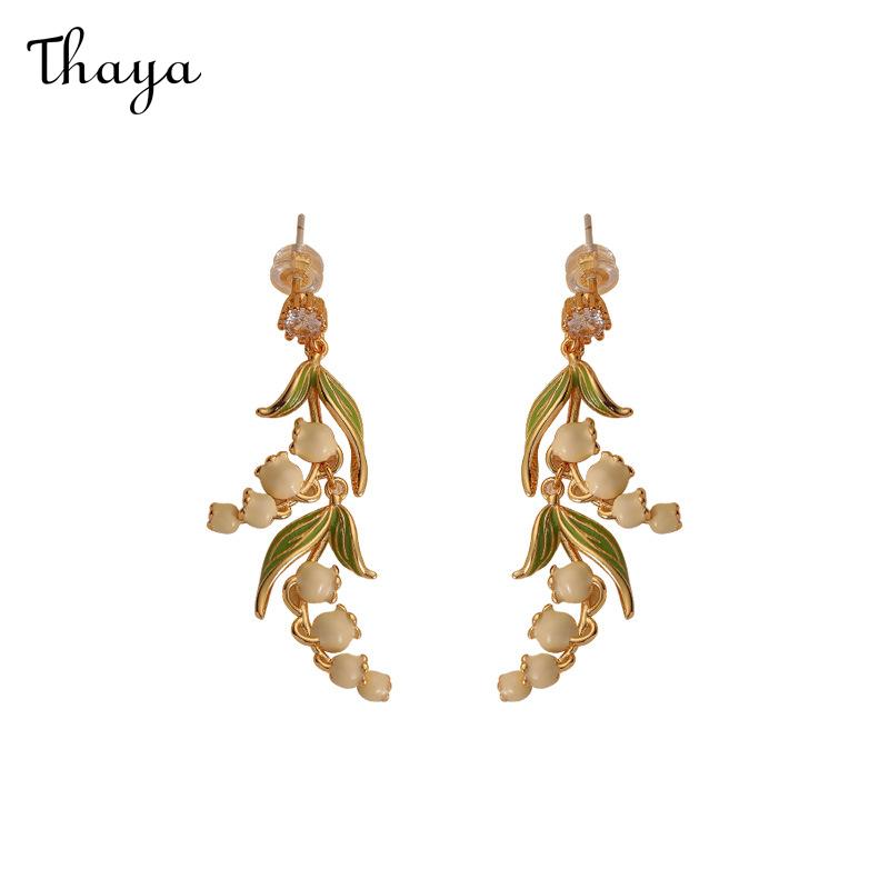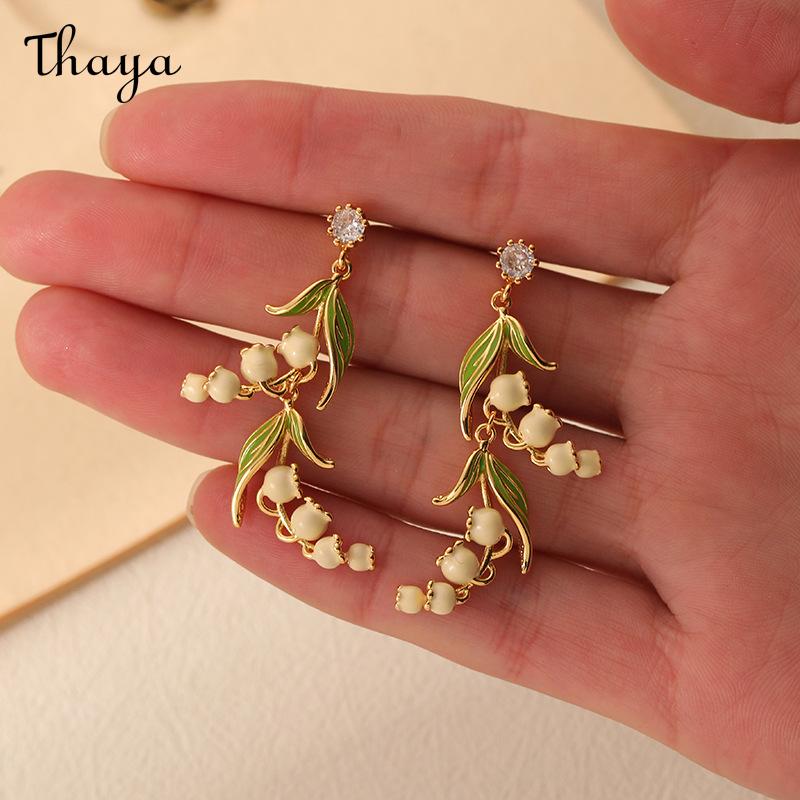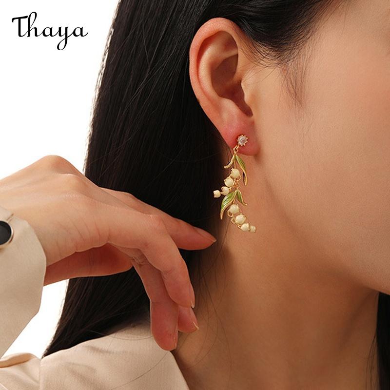 These charming earrings feature a delicate Lily of the Valley design. The earrings showcase clusters of cream-colored bell-shaped blossoms hanging gracefully from a gold-toned branch accented with green enamel leaves.
