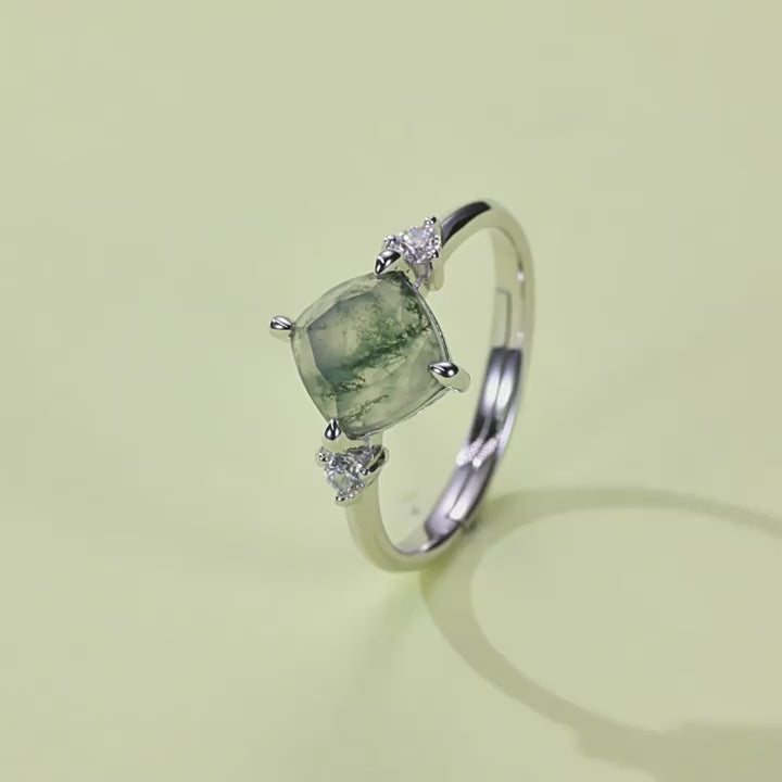 This exquisite ring features a unique green moss agate stone as its centerpiece. The stone, with its textured inclusions, is reminiscent of natural moss, giving each piece a distinct and organic feel.