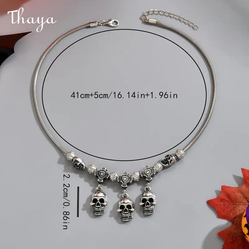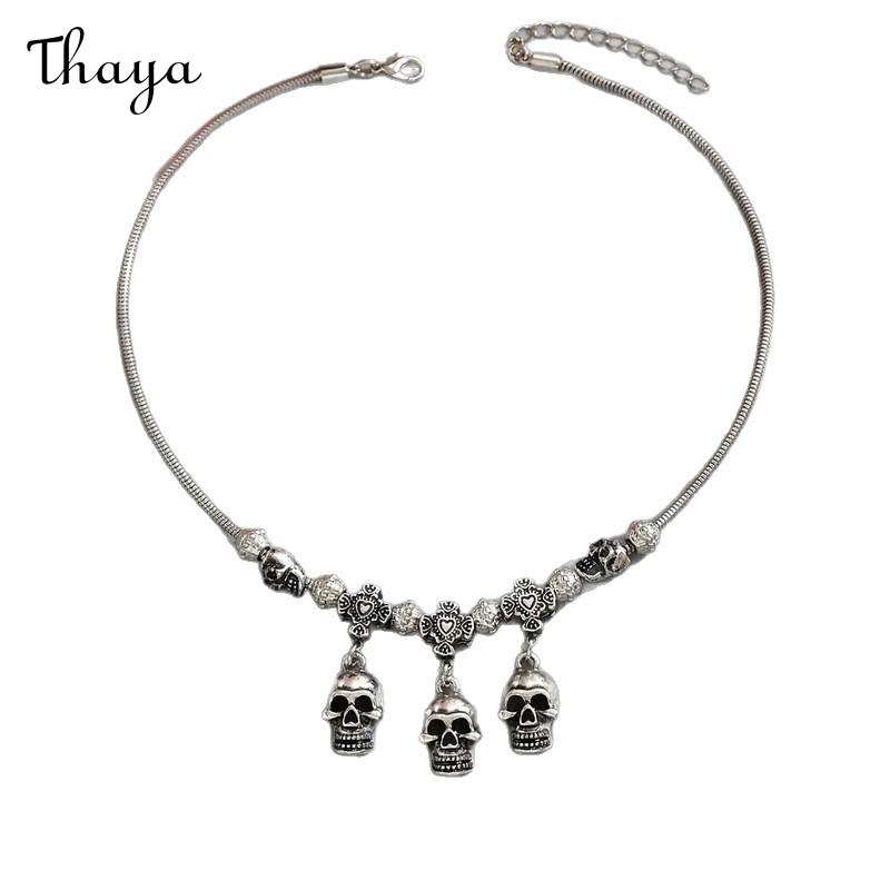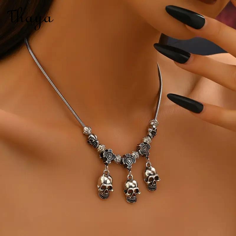 - Design: Features a delicate chain with three skull pendants hanging from floral and skull bead connectors.