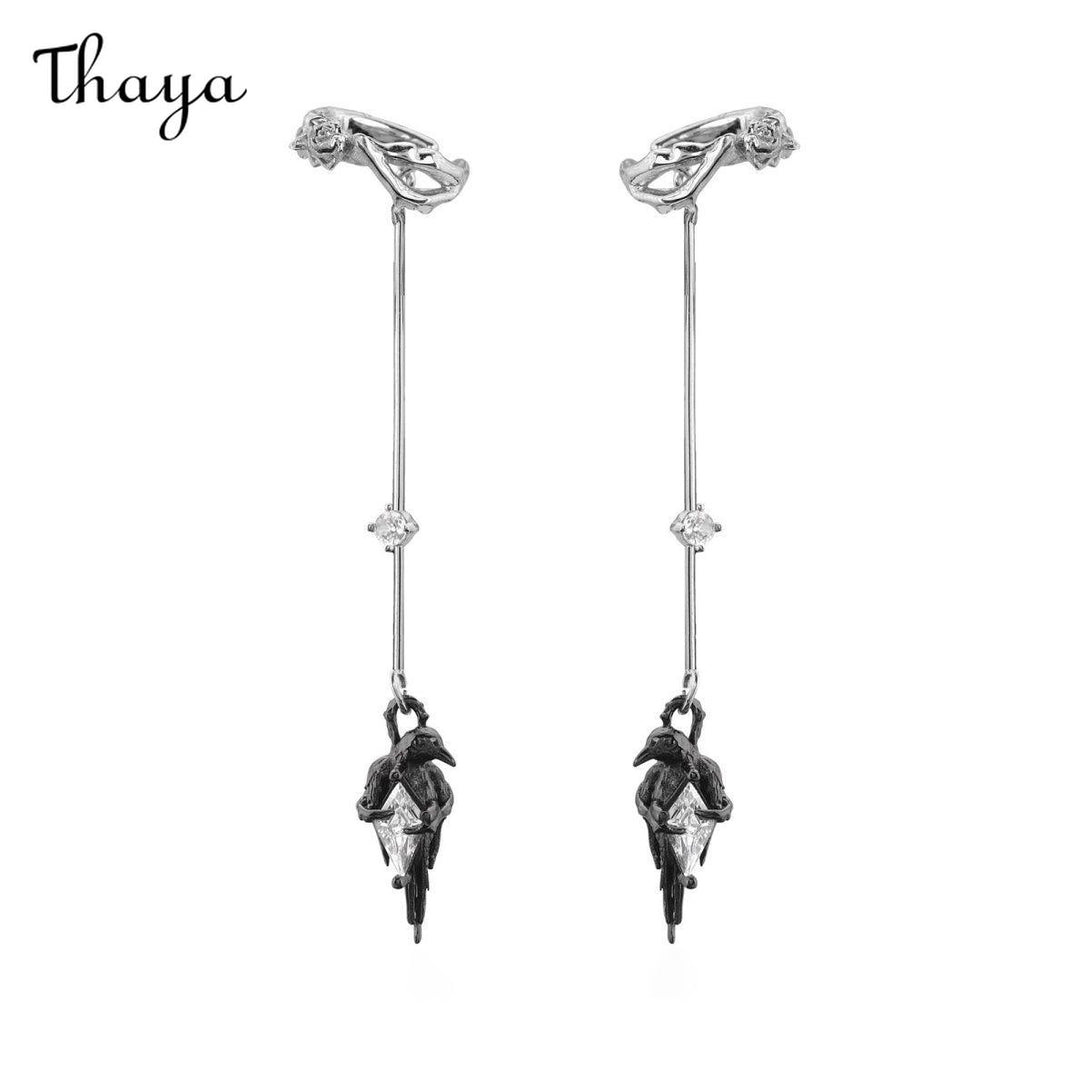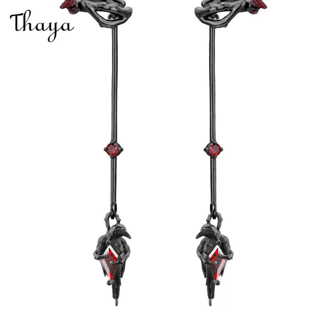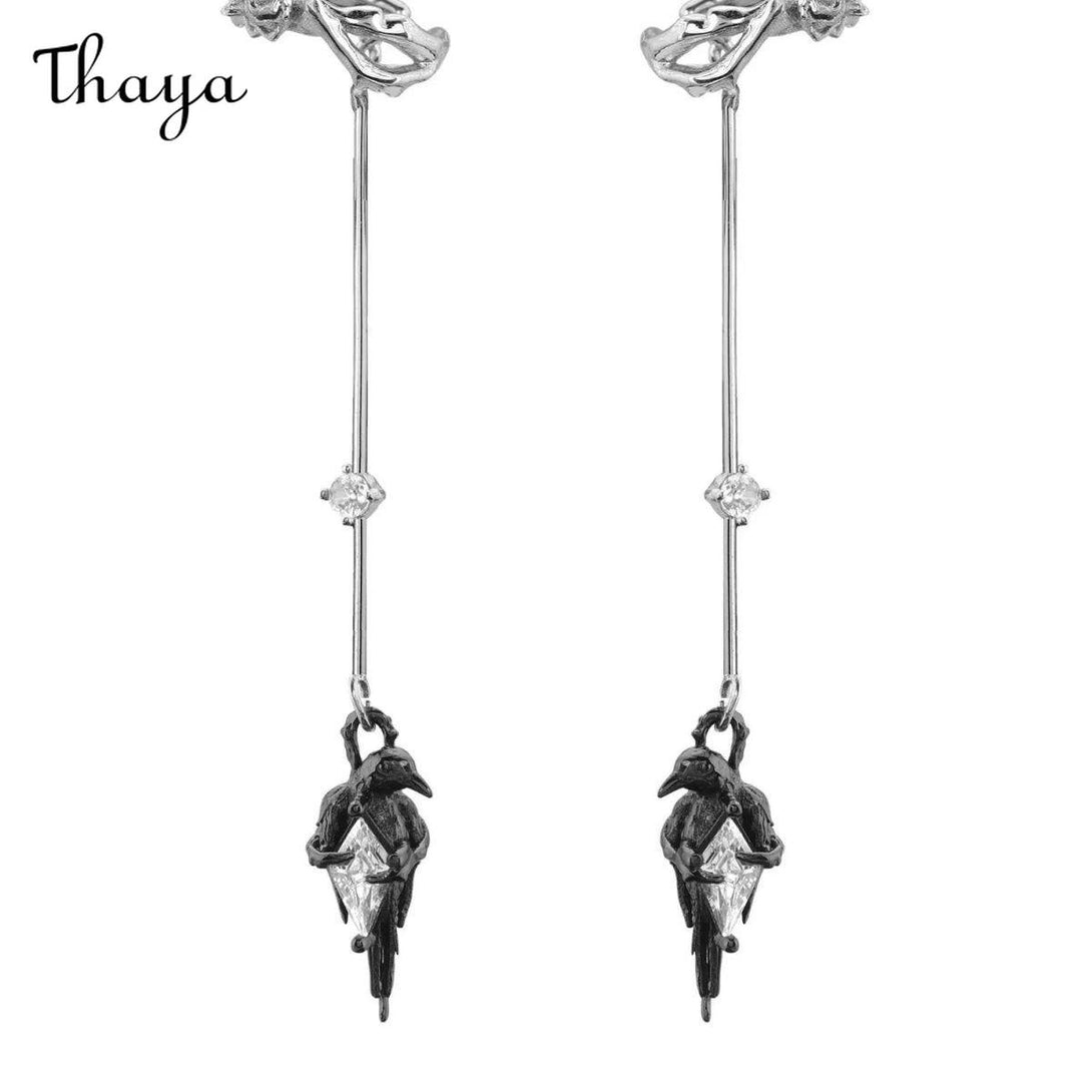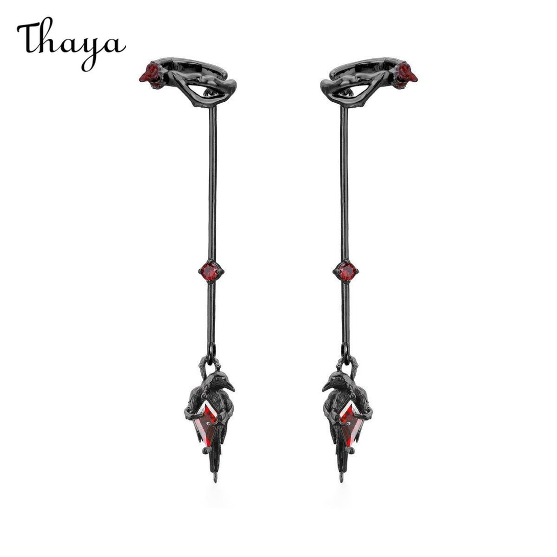 These unique dangle earrings feature an artistic design with a bird holding a crystal. The design elements create a balance between gothic and modern aesthetics.