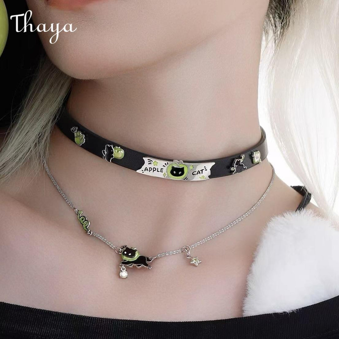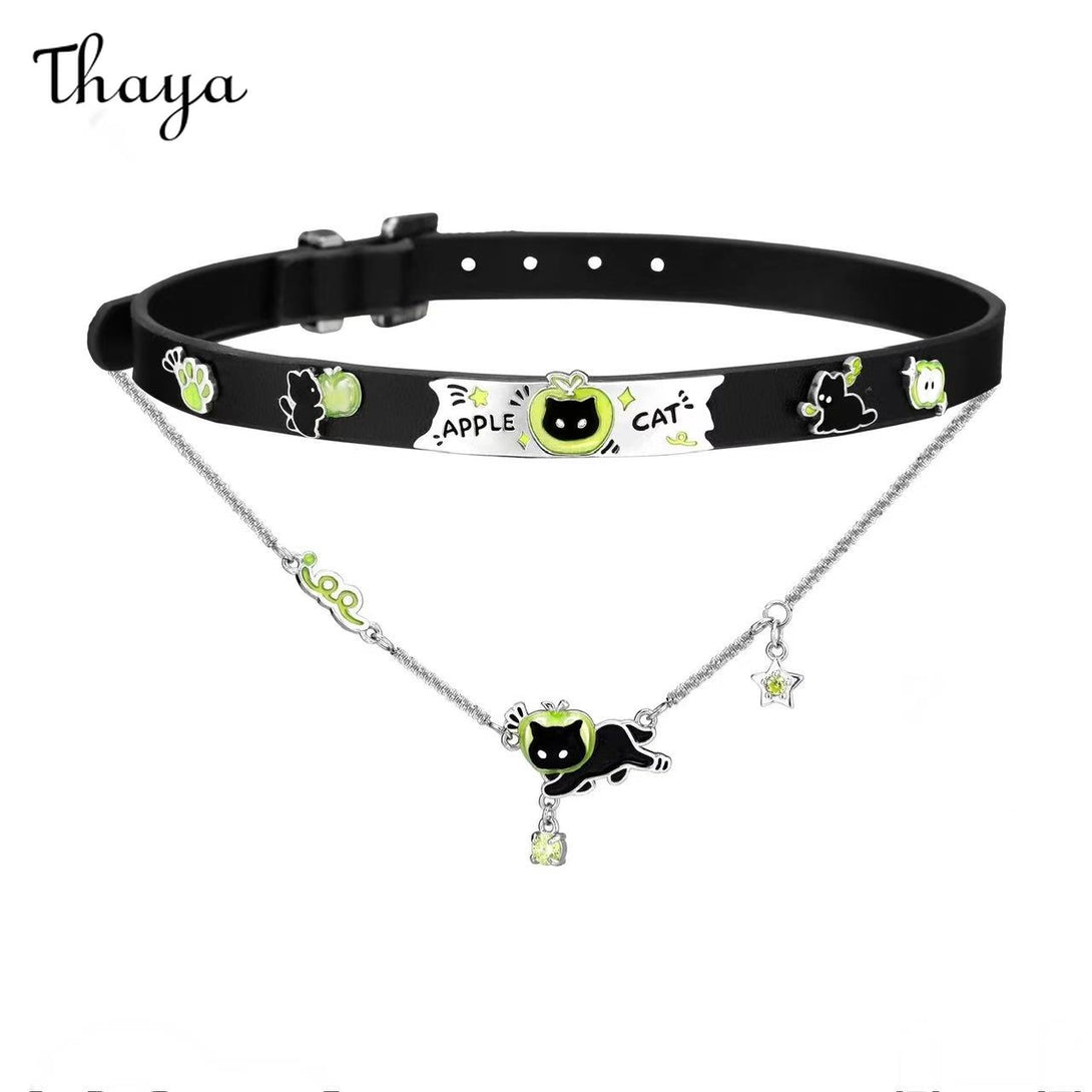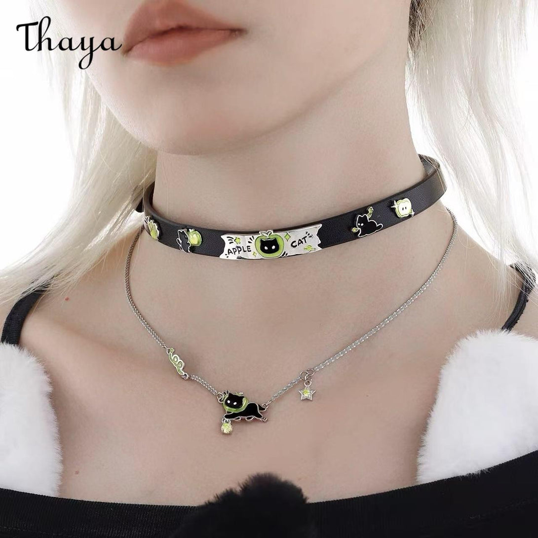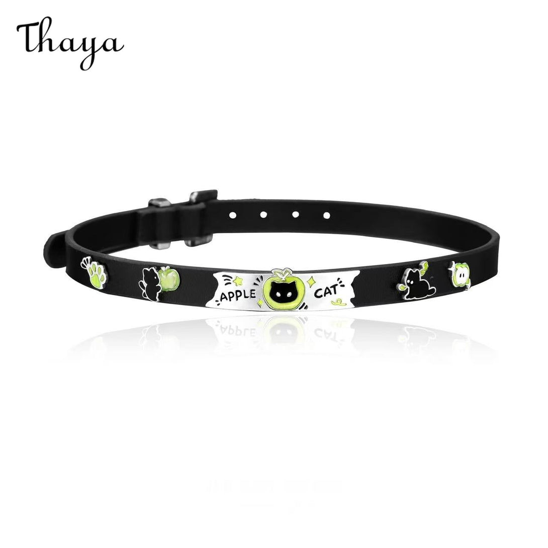 This adorable pet collar features a sleek black band adorned with alternating cat and apple charms. The charming design adds a playful touch to your pet's attire. The black band provides a striking contrast, making the colorful charms stand out.