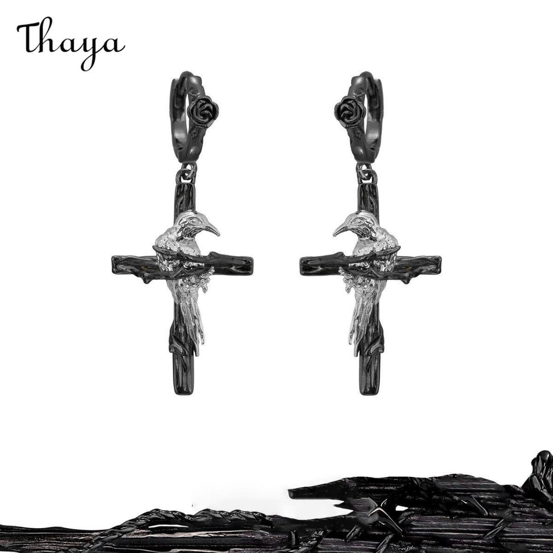 - Design: Unique dangle earrings featuring a raven perched on a cross design.
