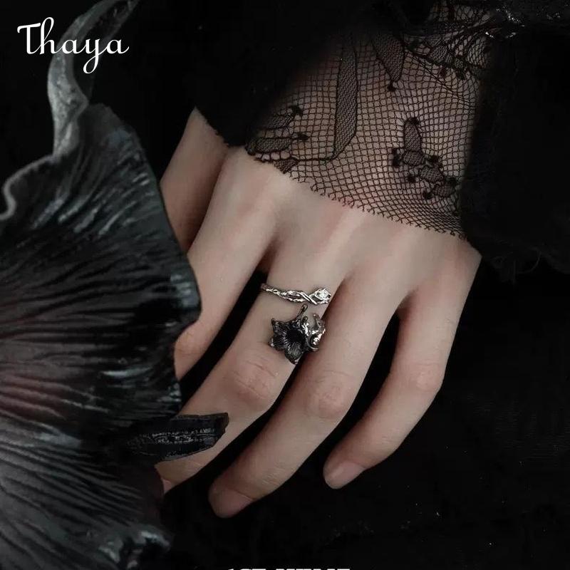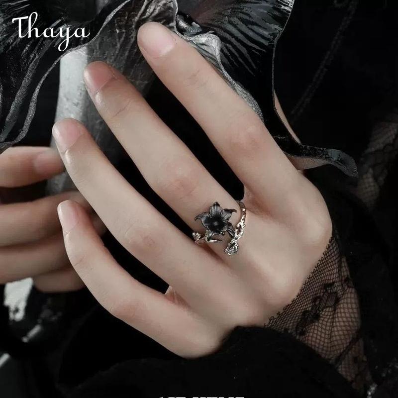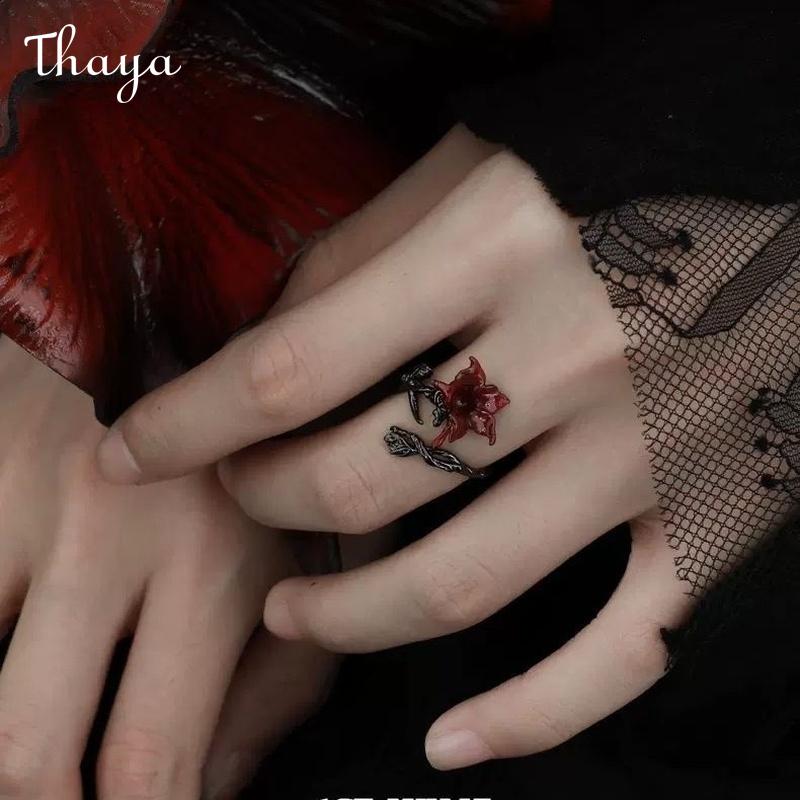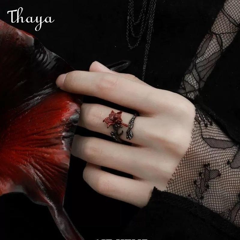 - Design: The ring showcases a red rose with a blackened stem and leaf, wrapping around the finger.