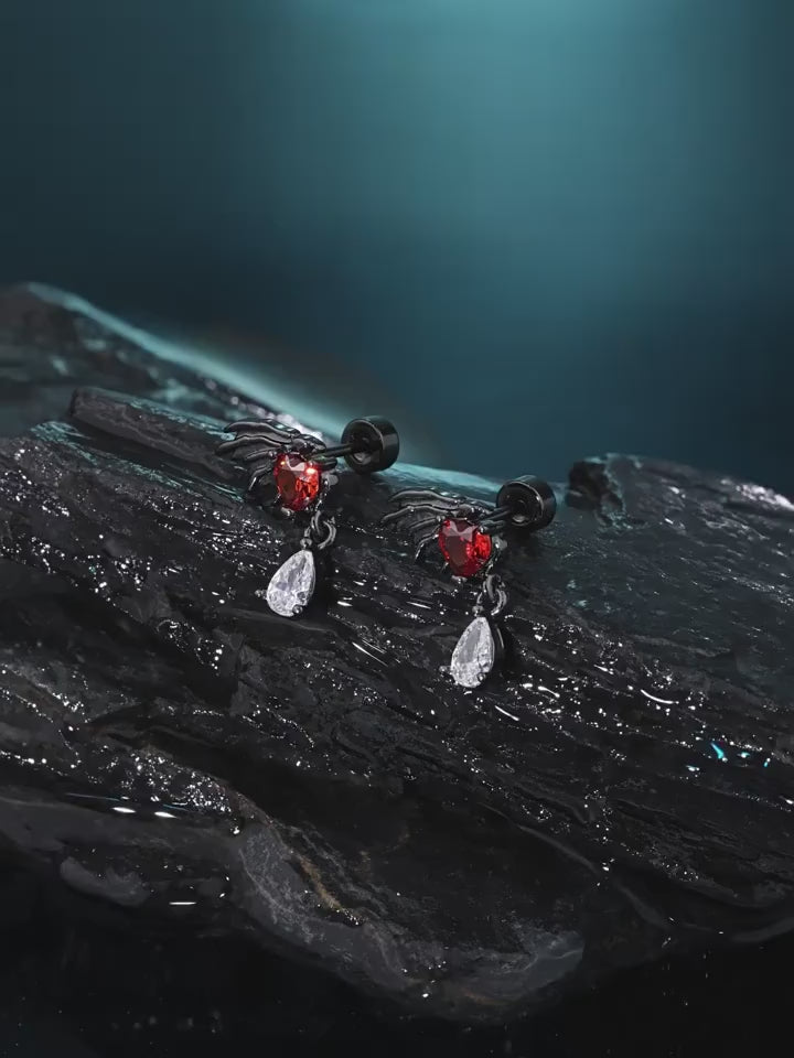 These unique earrings feature a gothic-inspired dragon wing design. Each earring showcases a striking combination of a triangular red gemstone, complemented by a teardrop-shaped clear gem dangling below.