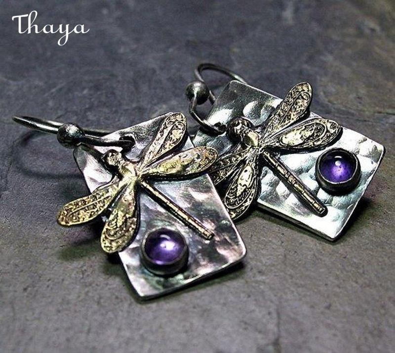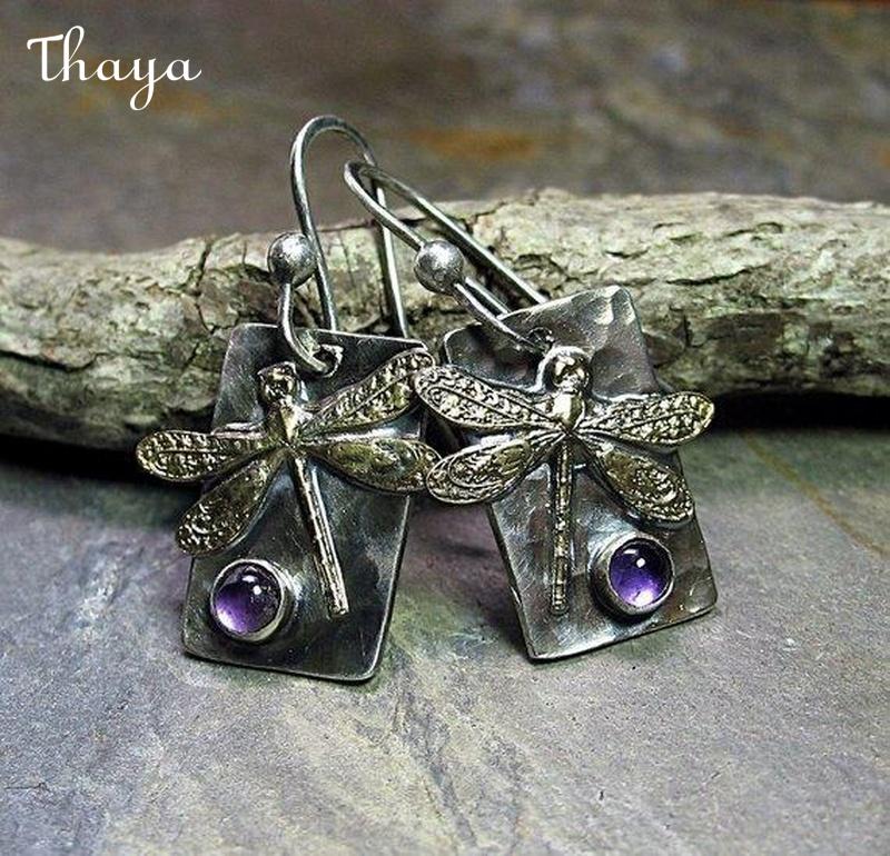 • Details: The dragonfly boasts detailed wings, and each earring is adorned with a round purple stone.