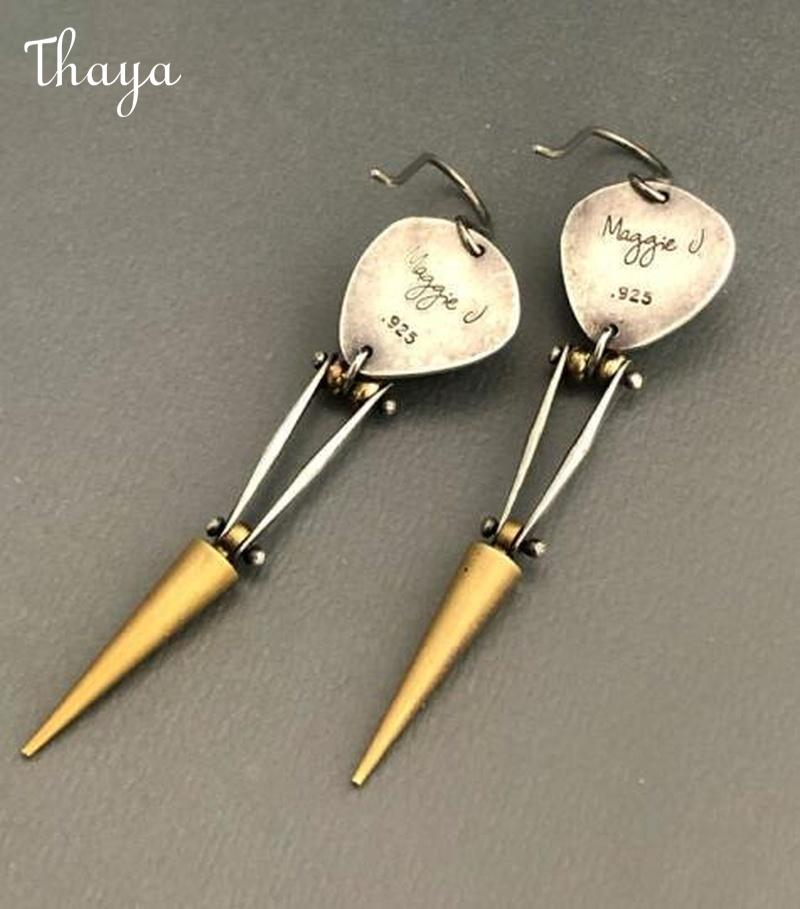 These stunning dangle earrings feature a unique geometric design, combining silver and gold tones for a modern yet artistic look.