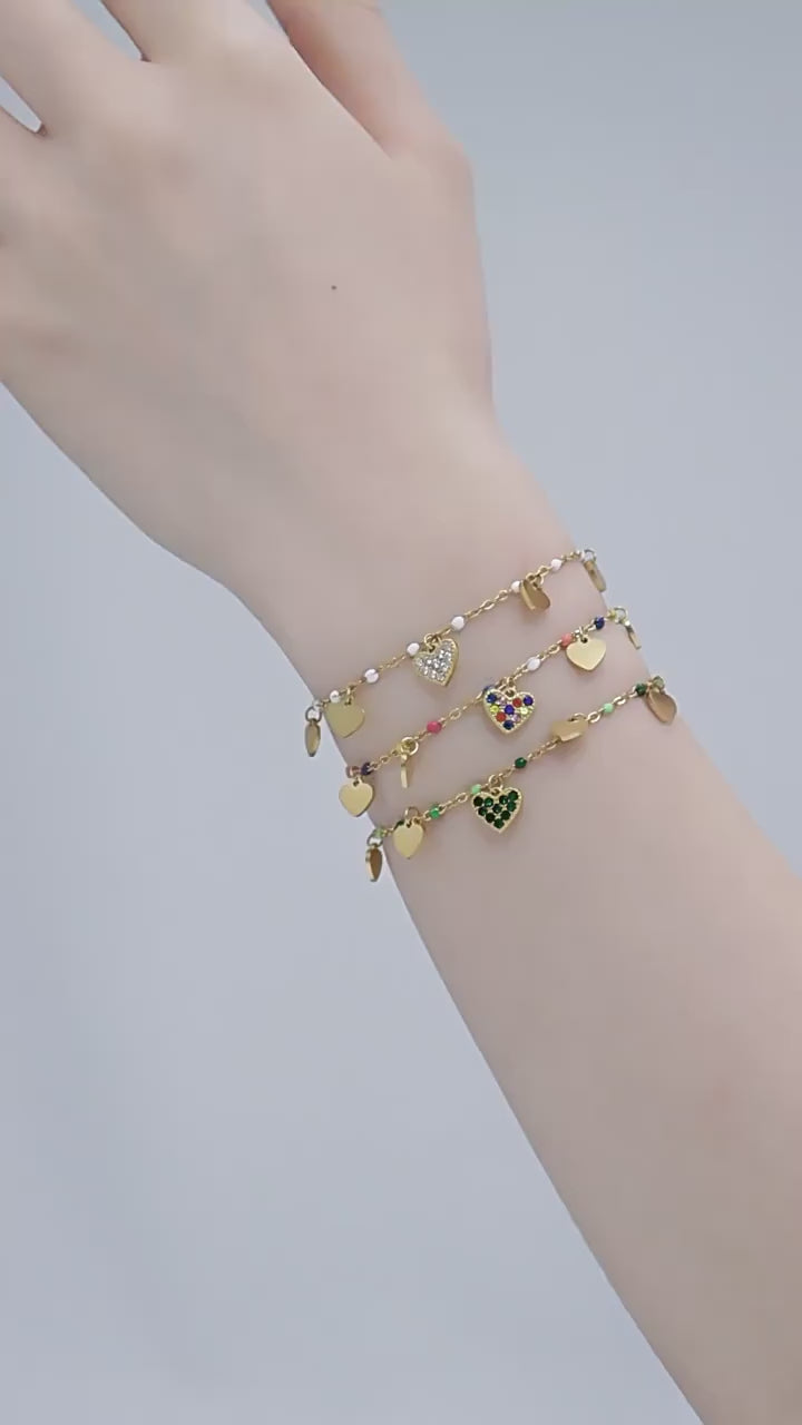 This charming layered necklace features three delicate strands, each with a unique design and heart charms. The gold-tone chains are adorned with colorful beads and heart pendants, creating a playful and stylish look.