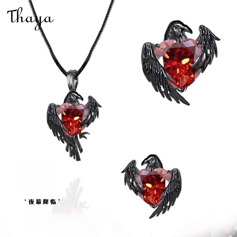 • Design: A sculpted raven with outstretched wings, embracing a faceted, heart-shaped red gemstone.