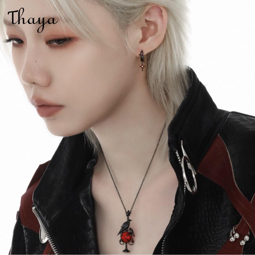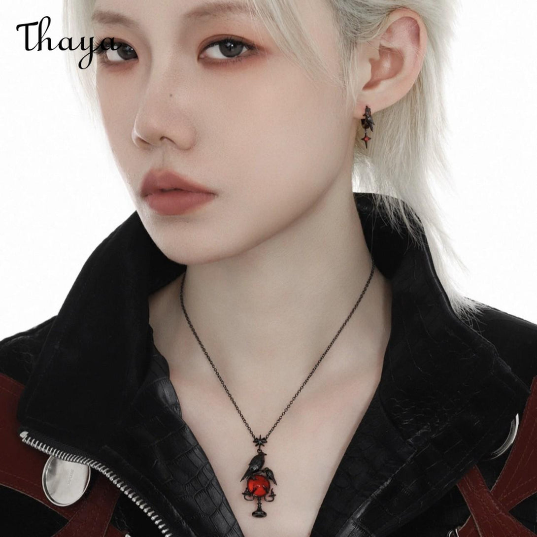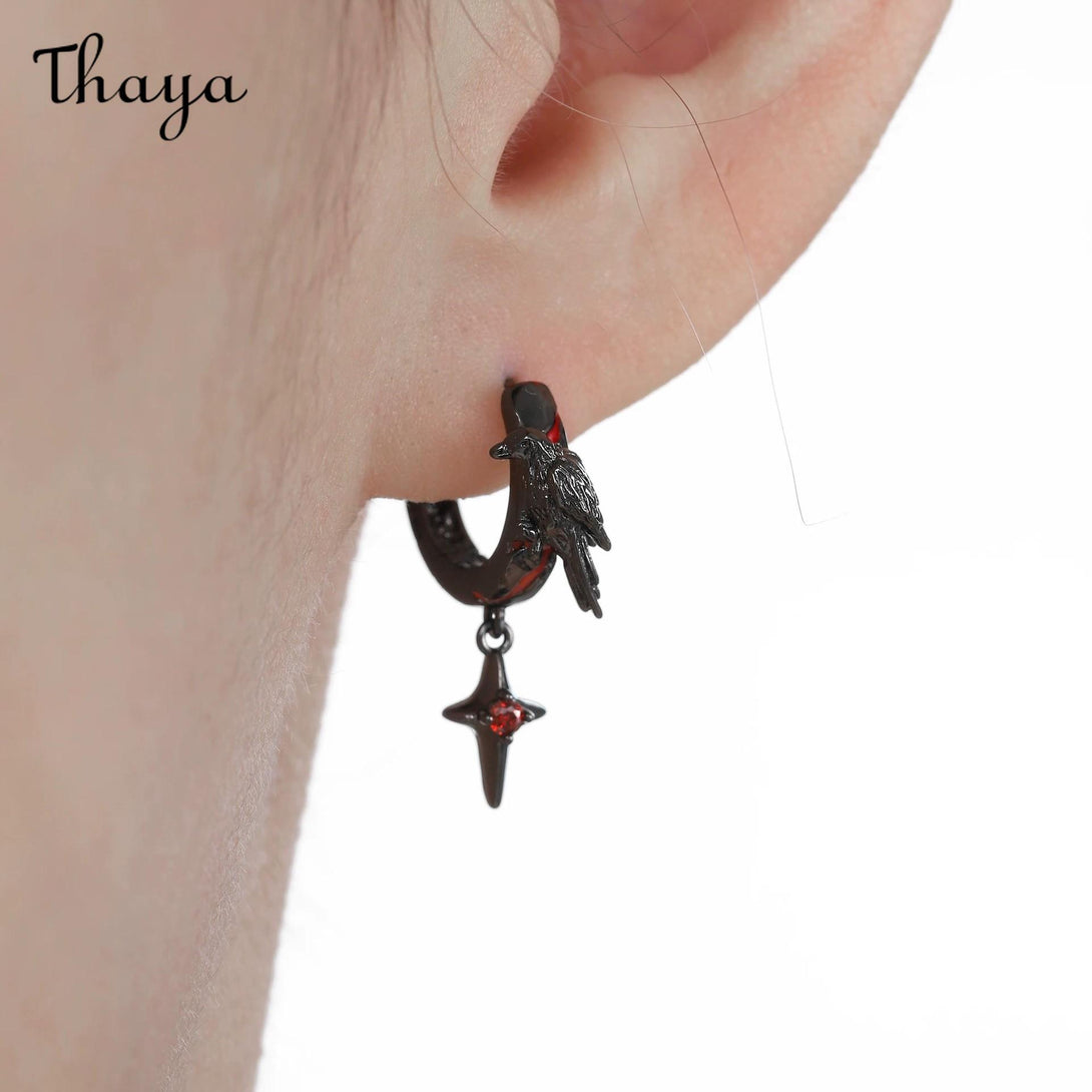 Embrace the mystique with these unique raven earrings. These hoop earrings feature a detailed raven perched on the hoop, with a dangling star charm accented by a red stone.