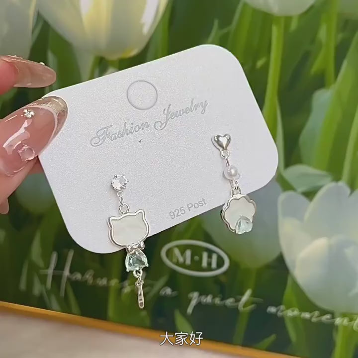 These earrings offer a unique and charming asymmetrical design, blending a playful cat motif with delicate floral elements.