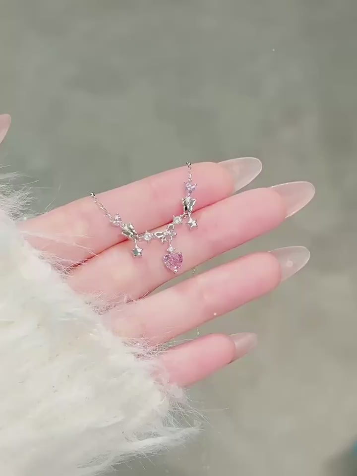 - Design: Features butterflies, stars, and a heart-shaped pink gemstone pendant.