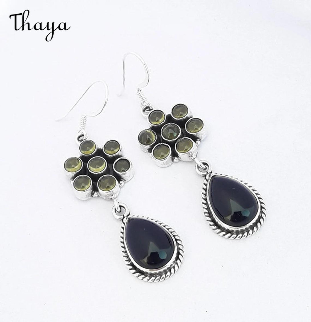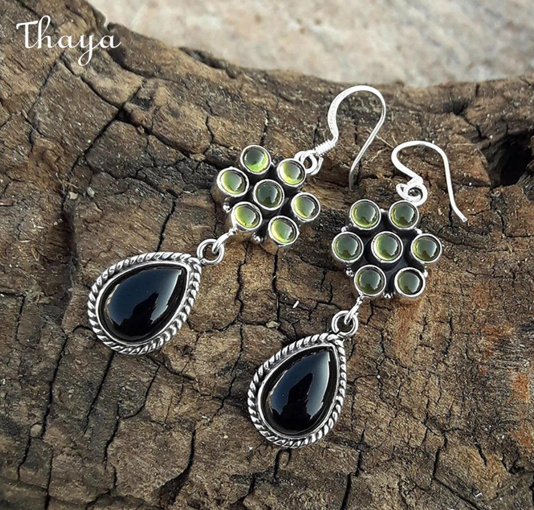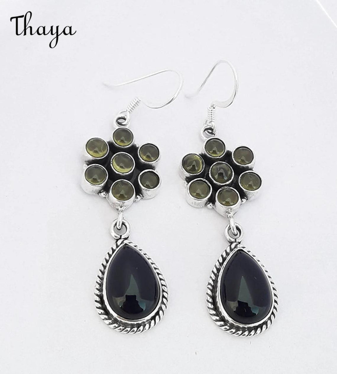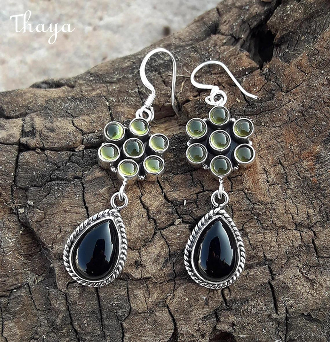 These elegant dangle earrings feature a floral cluster of round green gemstones at the top, connected to a teardrop-shaped black gemstone below. The gemstones are set in S925 sterling silver with intricate detailing around the edges, creating a vintage-inspired look.