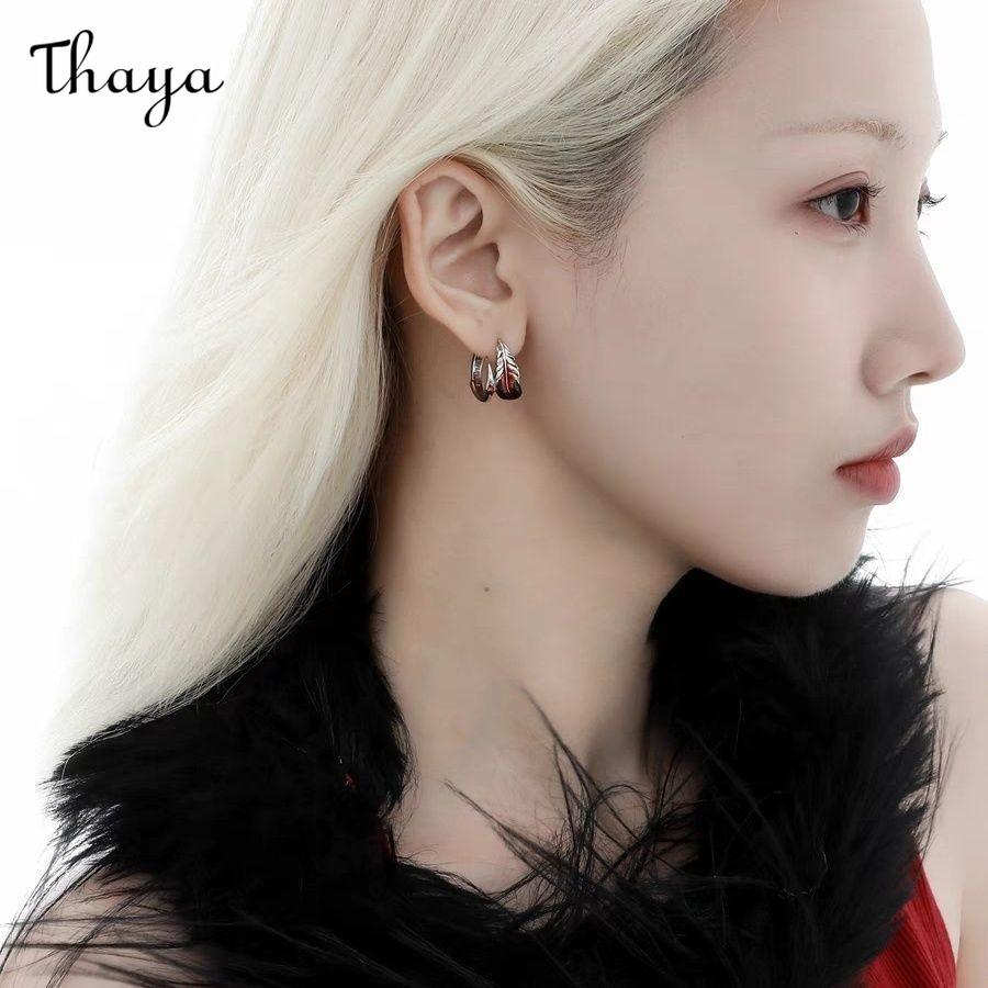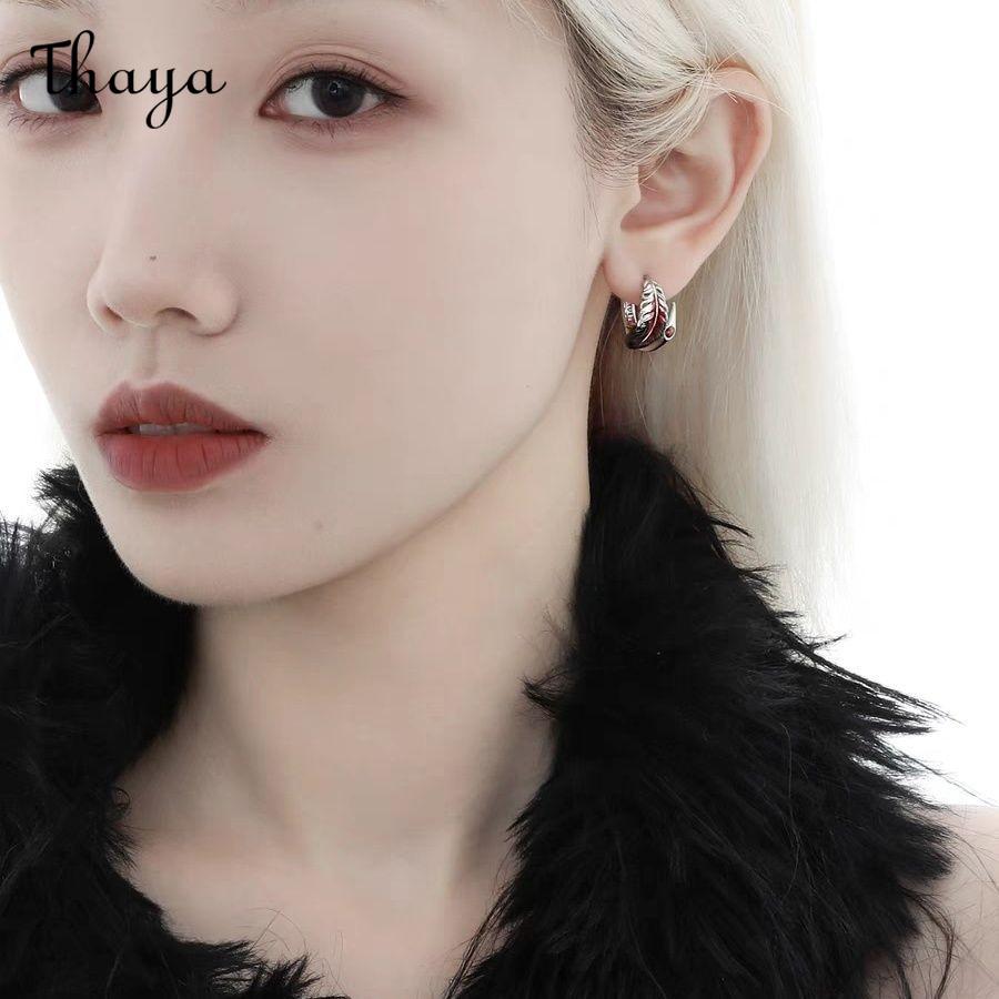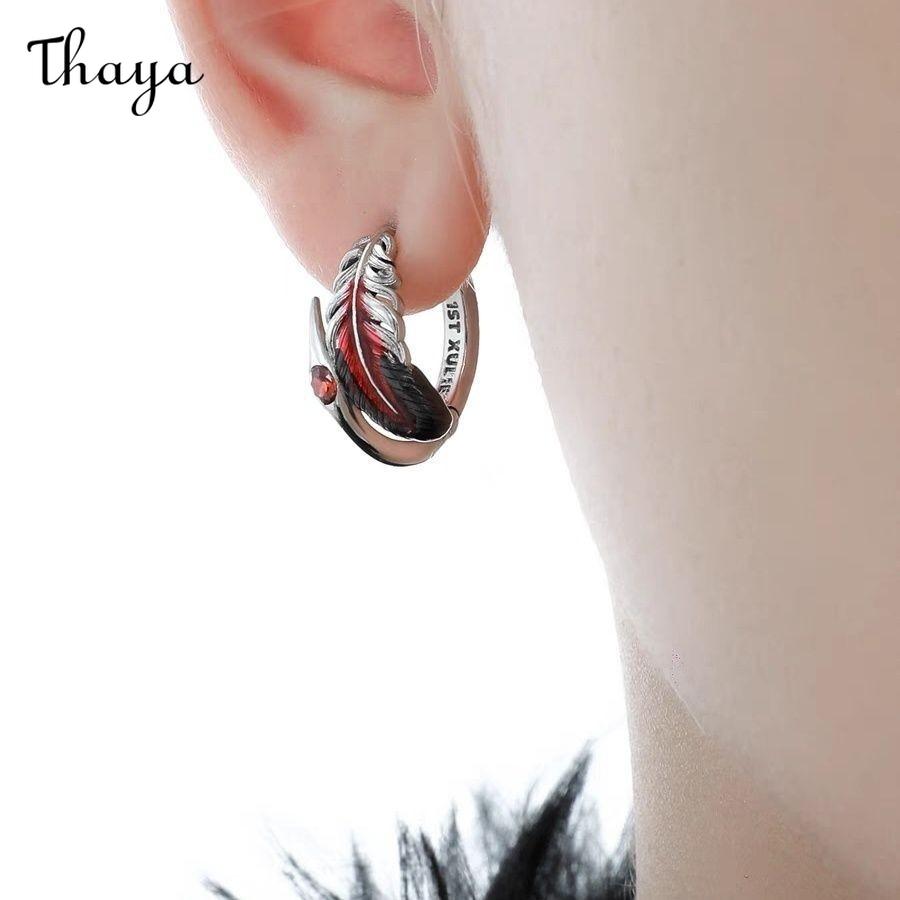This earring features a unique feather design. It's crafted into a hoop shape, with the feather detail wrapping around the front. The feather is colored with vibrant red and black, adding a touch of boldness. A small red stone is embedded near the base of the feather, providing a subtle sparkle.