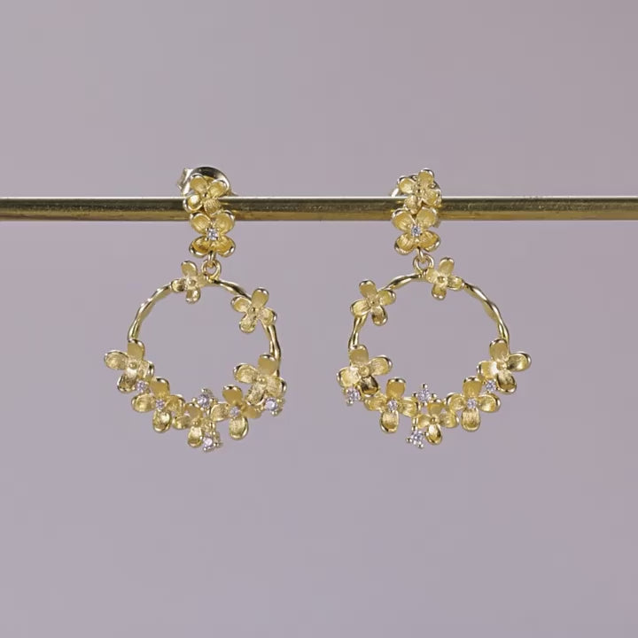 These elegant earrings feature a delicate floral design with a circular drop.