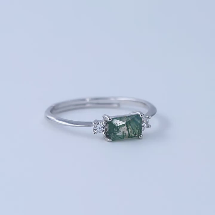 This delicate ring features a rectangular green moss stone as its centerpiece, exhibiting a natural, earthy aesthetic. The stone is flanked by two small, round stones on either side, adding a touch of brilliance to the design. The adjustable band allows for a comfortable fit.
