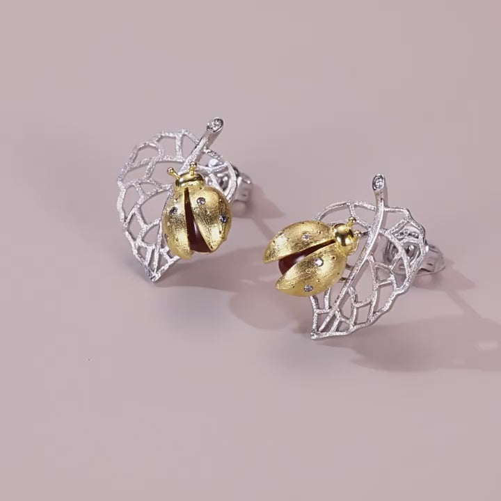 These charming earrings feature a delicate leaf design crafted from S925 sterling silver, plated with thick silver platinum and 10K gold coating. A vibrant ladybug, adorned with a 4.4*6.6mm red agate body and gold-toned shell with shimmering details, delicately hangs from the leaf.