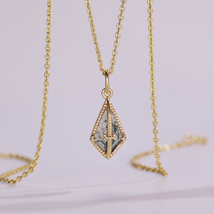 This elegant necklace features a unique kite-shaped pendant. The pendant showcases a captivating green moss stone, making it a standout piece.