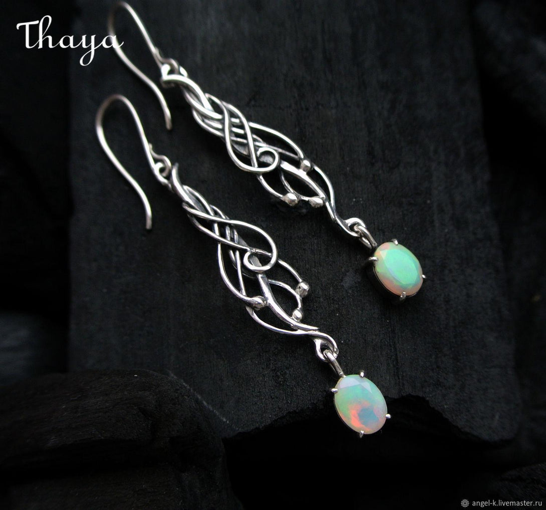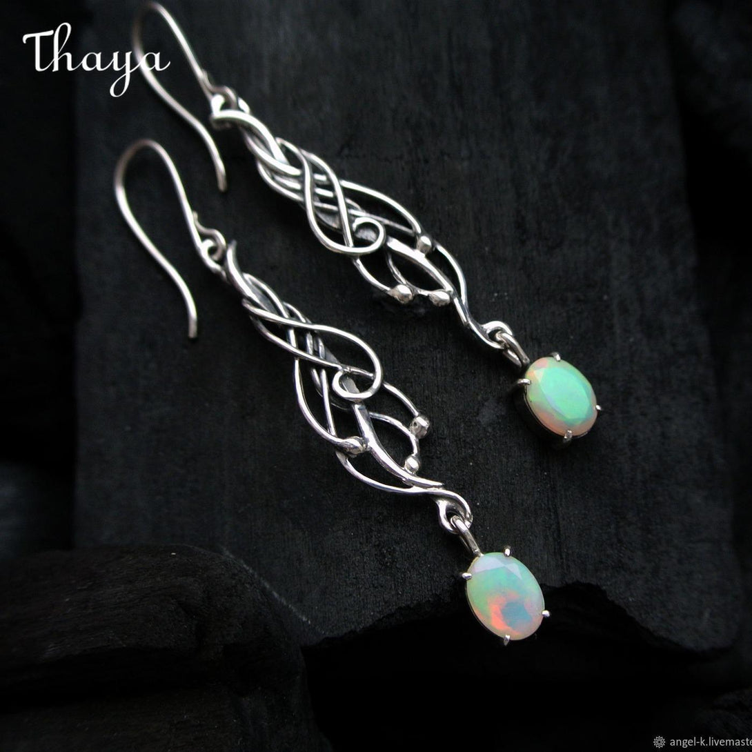 Elegant drop earrings featuring intricate Celtic knot designs and mesmerizing opal gemstones.