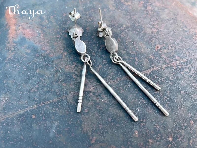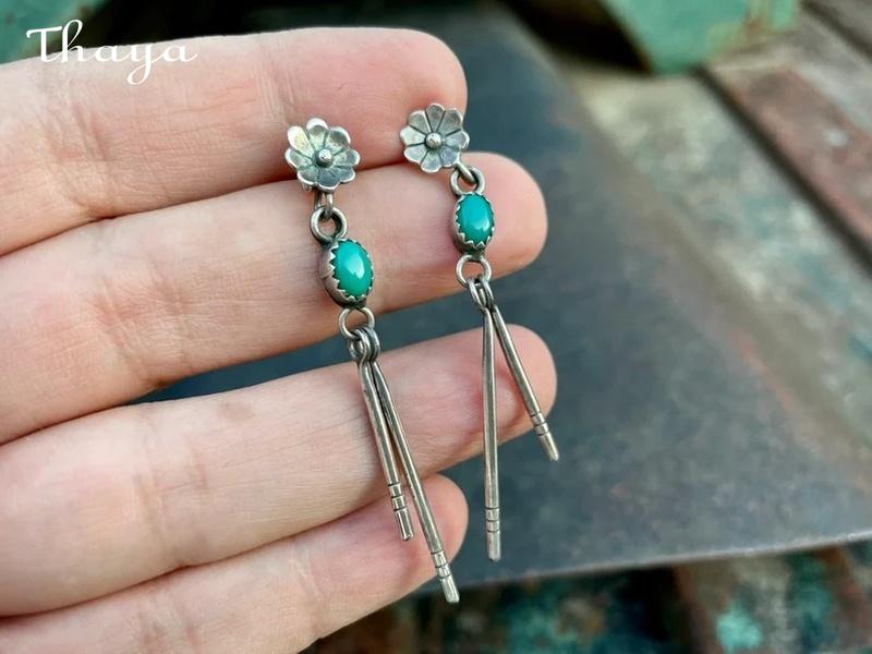 These earrings feature a delicate floral design at the top, leading to a vibrant, oval-shaped turquoise stone set in a detailed silver casing. Below the gemstone, two sleek, silver rods hang gracefully, adding a modern touch to the classic design.